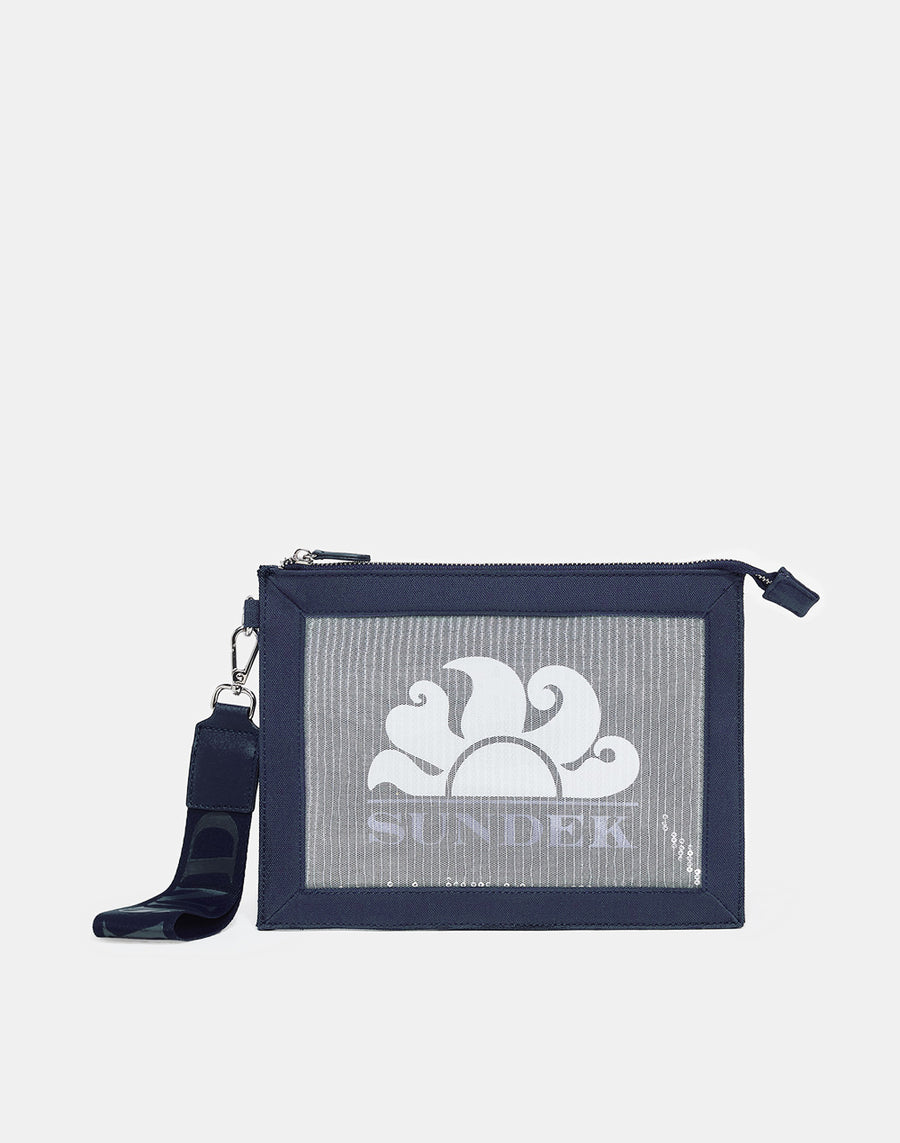 Sequinned mesh clutch bag with an embroidered Sundek logo. Perfect as a toiletry bag or a clutch bag. Detachable strap with the Sundek logo. Size: 27 x 20.5cm