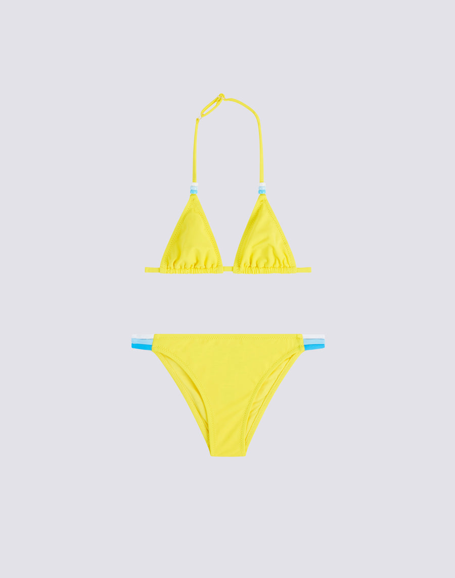 Girl's swim bikini with an adjustable triangle top with ties at the back of the neck embellished with three-coloured beads. The three colours of the beads are repeated on the tricolour detail on the side of the bikini bottom. The two-piece swimming costume is made of VITA by Carvico fabric that is comfortable, resistant and not afraid of chlorine and sun creams.