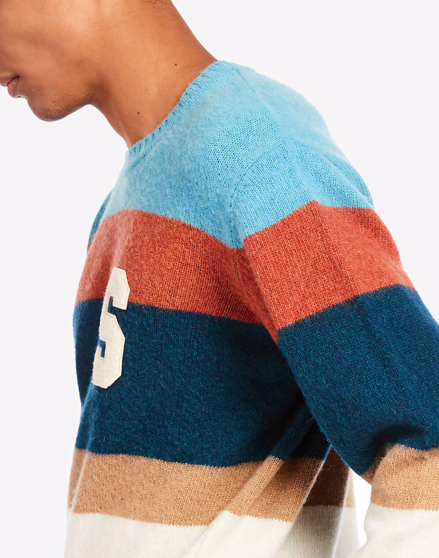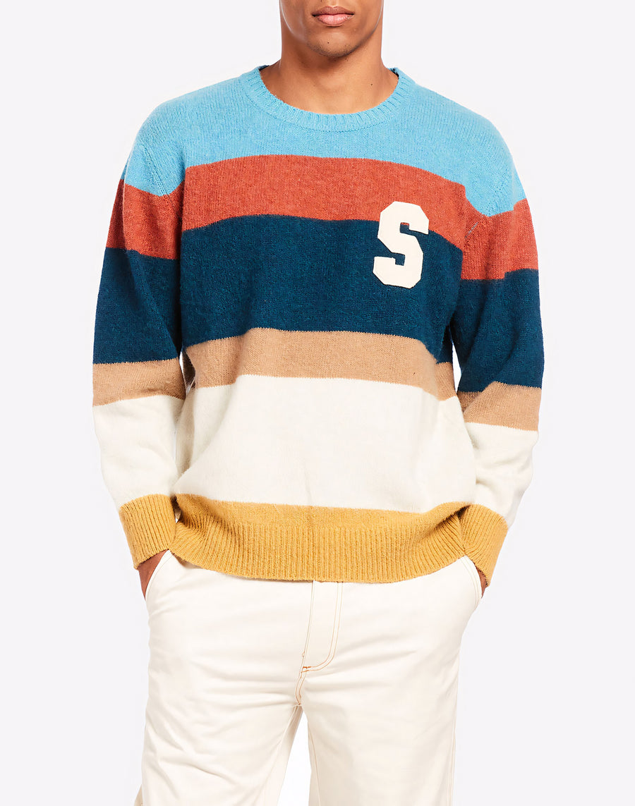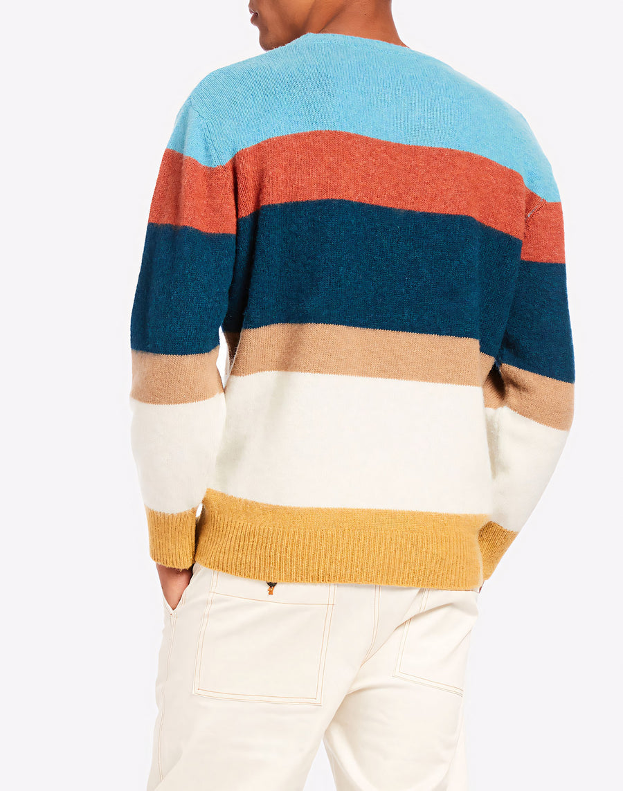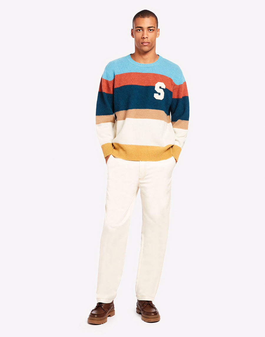 This men's oversized knitted crew neck pullover, embellished with multicoloured stripes, is a great addition to all your outfits.