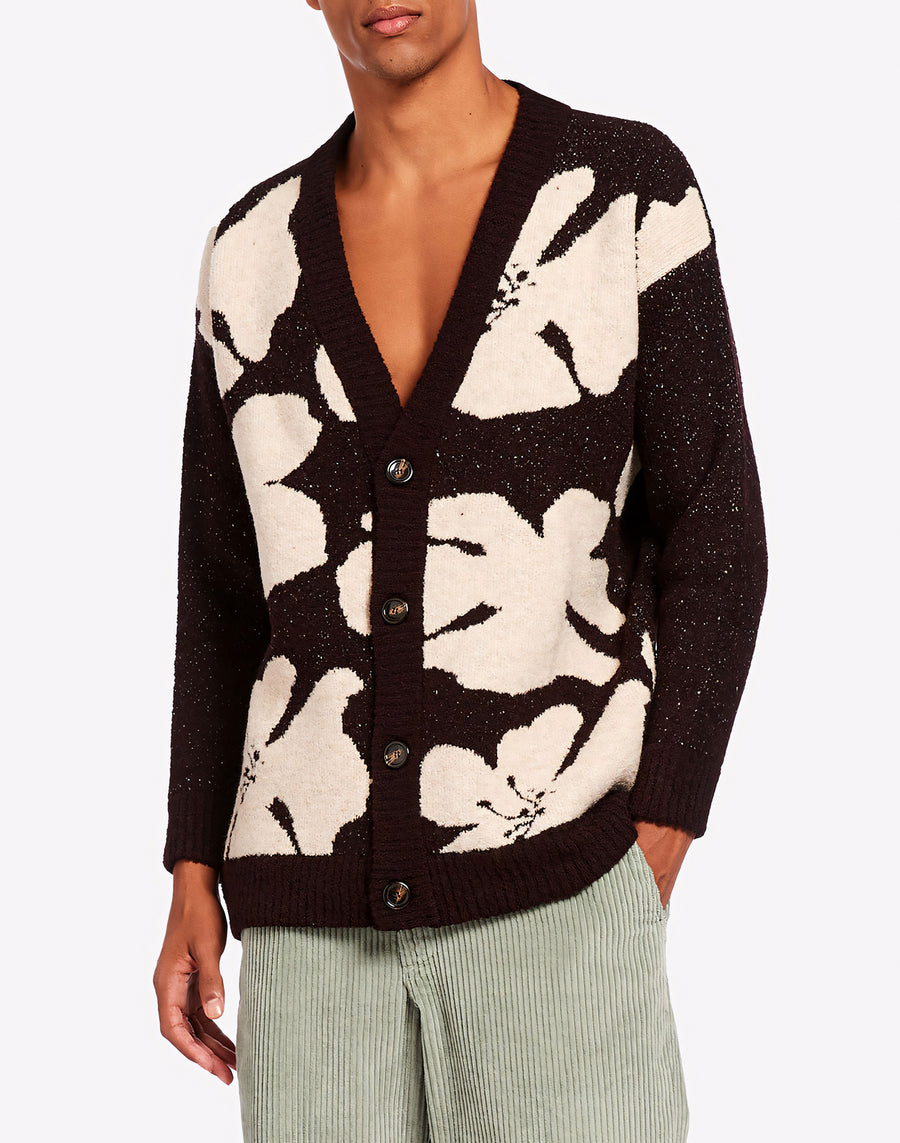 Ideal for everyday activities and leisure time, this men's oversized cardigan blends practicality and style. Finished with a contrasting jacquard flower.