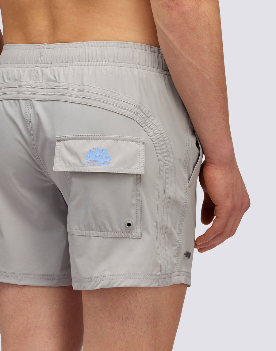 GoldenWave Sundek men's swimsuit, with delicate tone-on-tone rainbow back, drawstring and elasticated waist. Back pocket with embroidered logo. The model is 188cm tall and wears a size M.