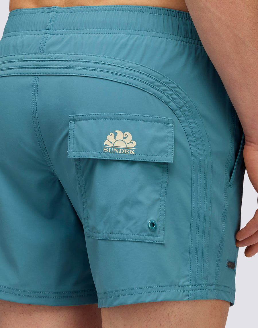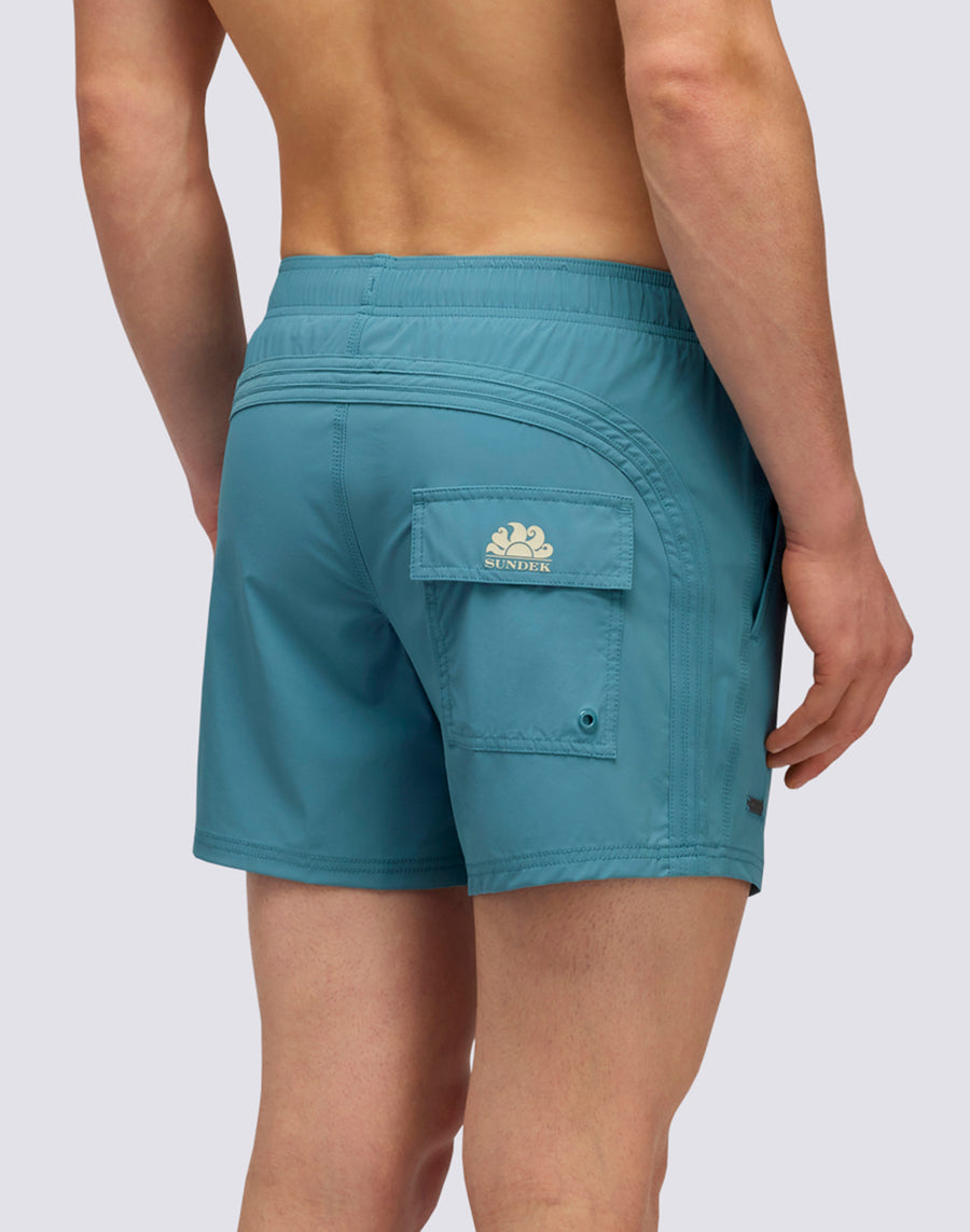 GoldenWave Sundek men's swimsuit, with delicate tone-on-tone rainbow back, drawstring and elasticated waist. Back pocket with embroidered logo. The model is 188cm tall and wears a size M.