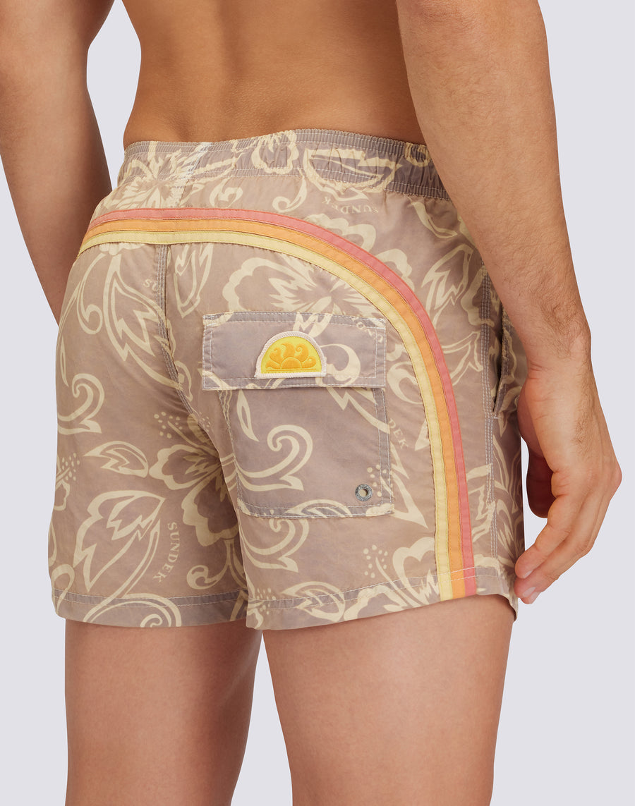 Get ready to ride the next wave with the Goldenwave elastic-waisted short swimming costume in the historic Sundek SK23 print, treated and dyed with artisanal techniques. The historic nylon taffeta fabric and pattern construction make it fast drying and super durable season after season.
