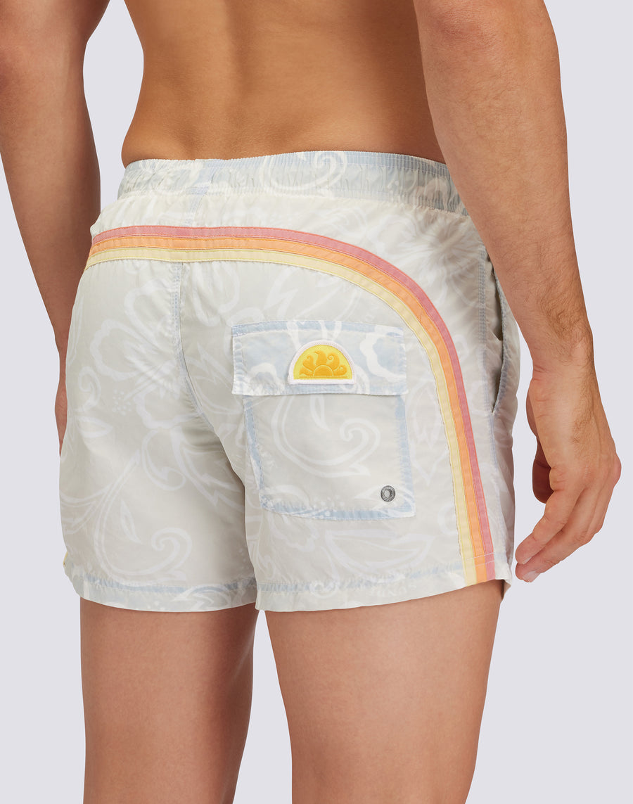 Get ready to ride the next wave with the Goldenwave elastic-waisted short swimming costume in the historic Sundek SK23 print, treated and dyed with artisanal techniques. The historic nylon taffeta fabric and pattern construction make it fast drying and super durable season after season.