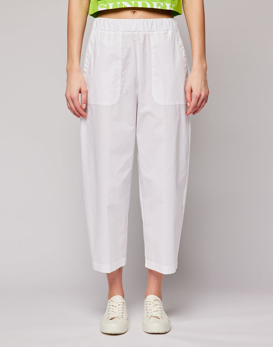 Elegant and fresh multitasking trousers in cotton poplin. High elastic waistband and internal adjustable drawstring for maximum comfort.