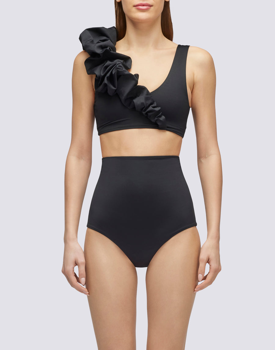 Timeless elegance with this high-waisted culotte briefs and double-layer construction. The sinuous lines and the softness of the fabric make this garment a must-have for your swimsuit wardrobe. Match it with the coordinated bralette top, the romantic effect is guaranteed.