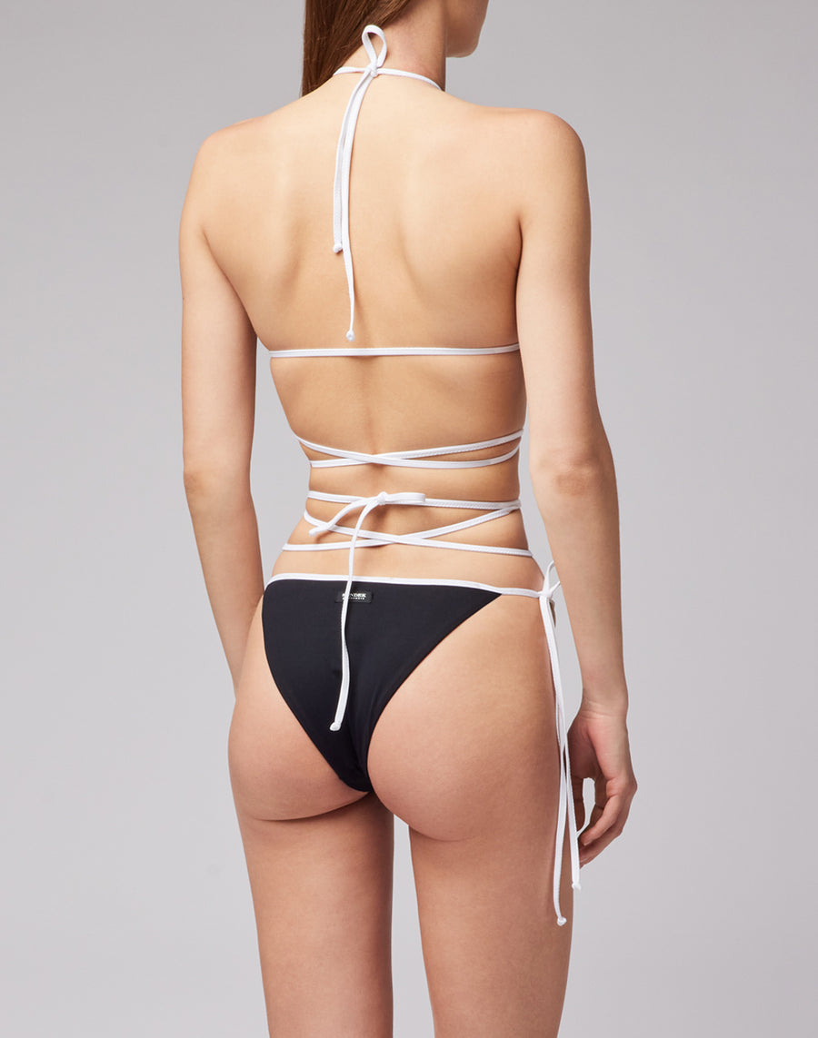 A unique and inimitable costume that accentuates the color contrasts thanks to the presence of the laces that cross behind the back and neck. Add a touch of elegance to your beach looks with this original triangle top.