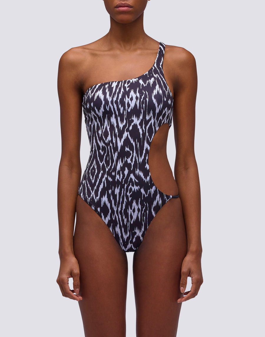 One-shoulder swimsuit with side opening and Abstract Wind print.