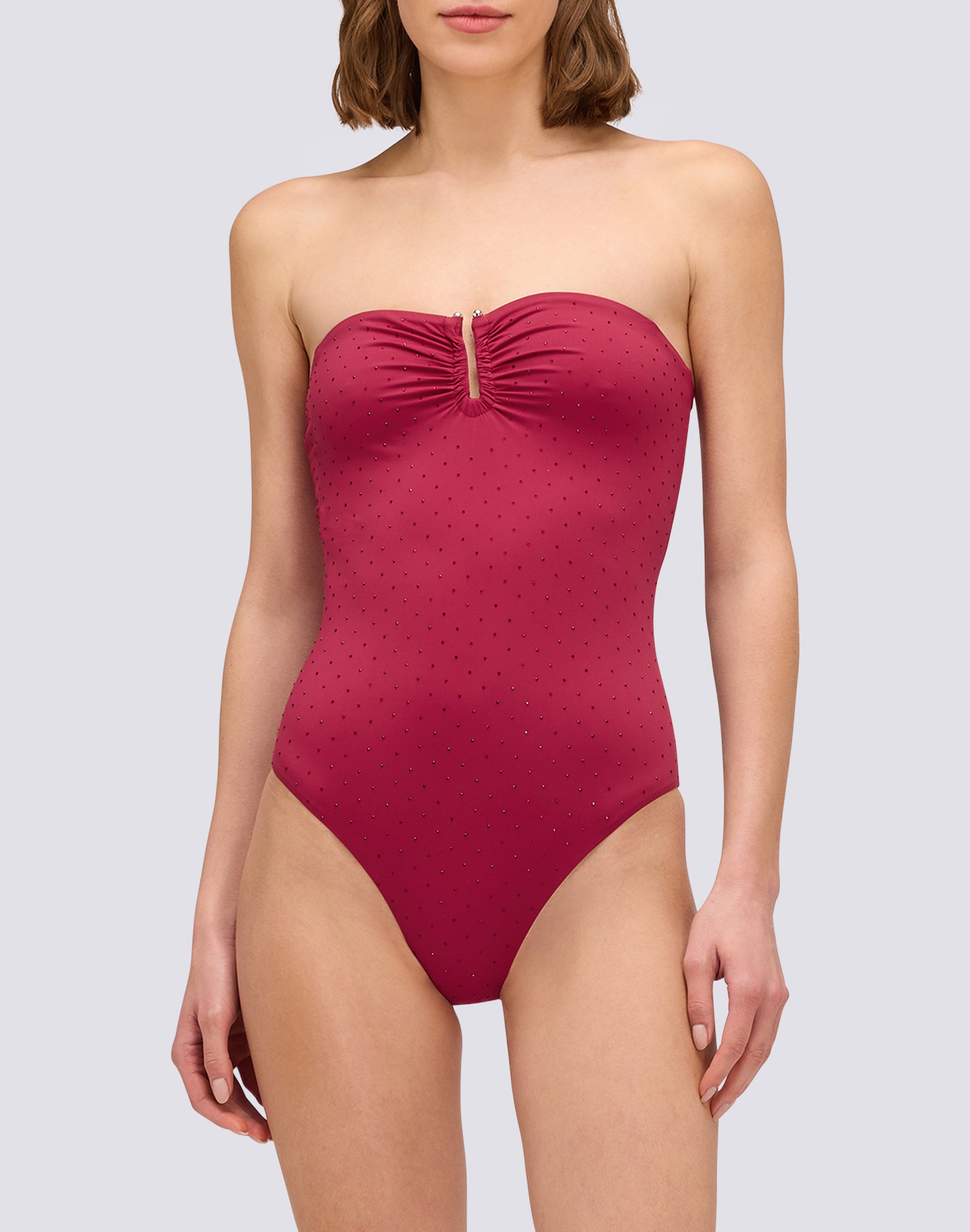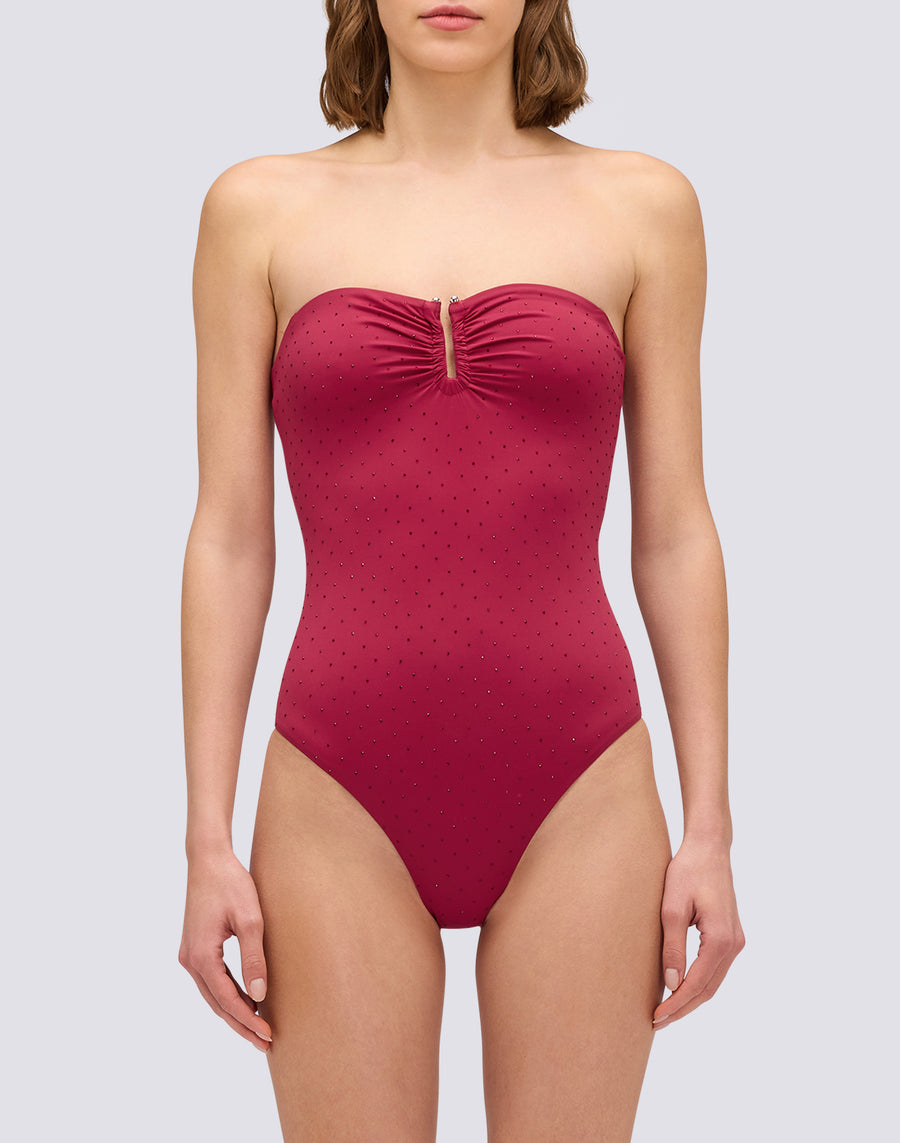 The one-piece swimsuit with rhinestones and high back is vintage glamour reinterpreted: sparkle that catches the light, elegant coverage, a defining central slit. For those looking for a retro-chic style with character. This is the swimsuit that turns every moment at the beach into a special occasion. Glamour, elegant coverage, sparkle that stands out.