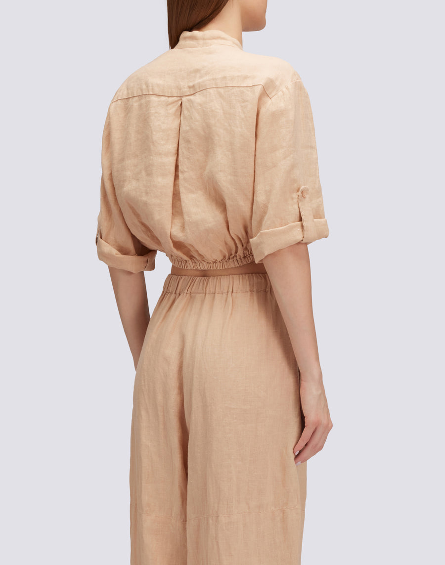 Garment-dyed linen shirt with cropped cut and knot fastening, gathered sleeves and mandarin collar. Fresh and jaunty, for informal and casual looks.