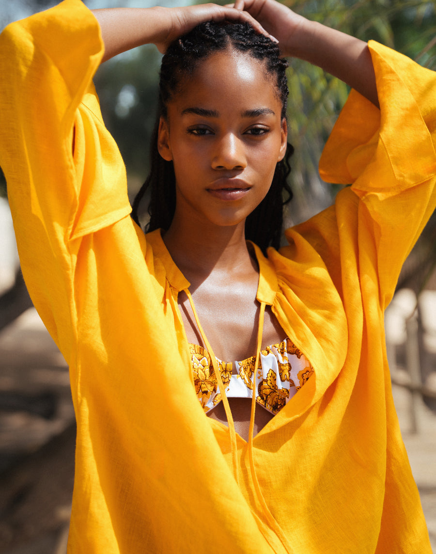 Long-sleeved, garment-dyed linen short dress with mandarin collar and adjustable ties. Fresh and light for your next summer look!