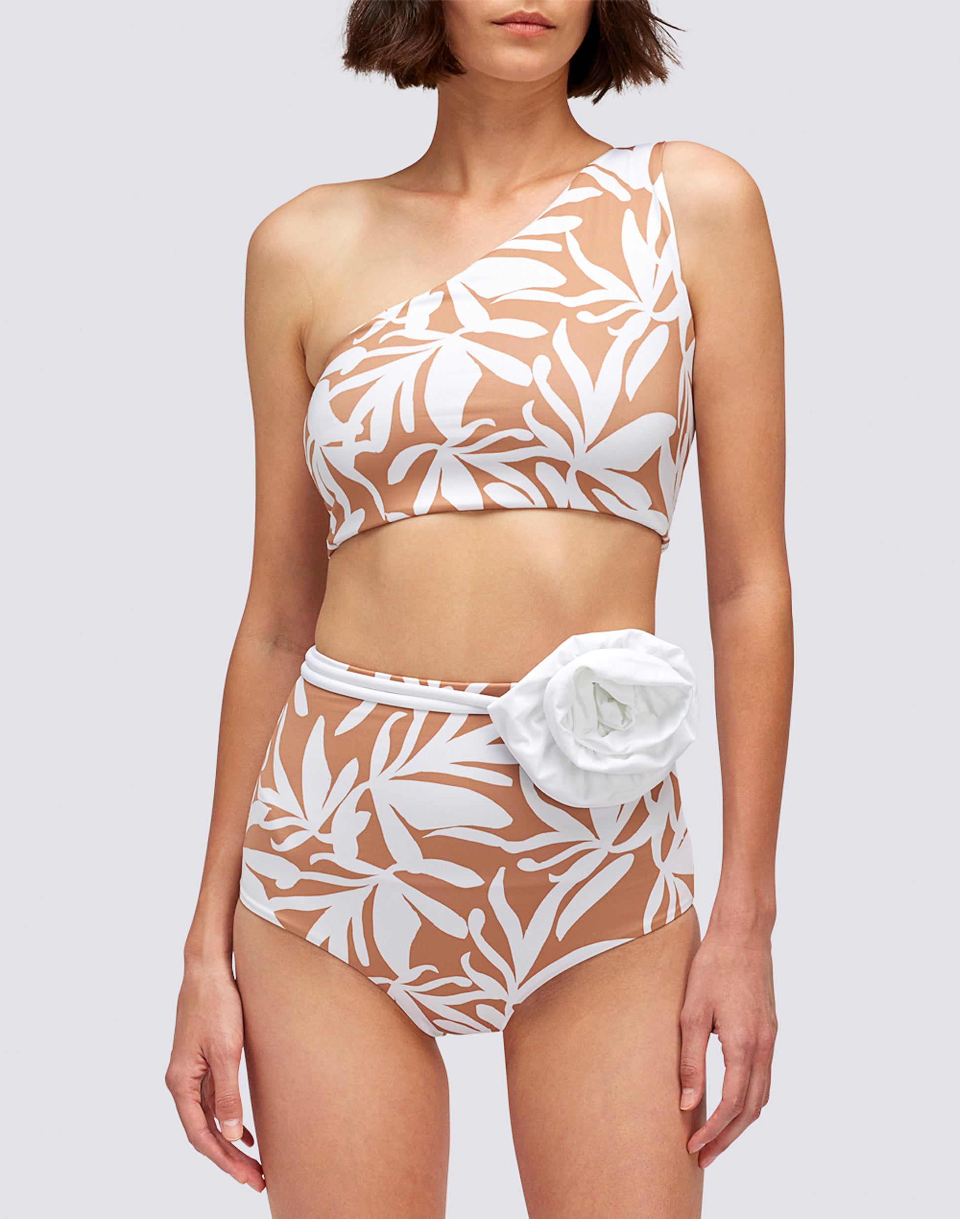 The BIMALA one-shoulder top, with its optic flower print, will make you feel elegant and fashionable, to always be glamorous even on days at the beach. To be combined with the coordinated briefs.