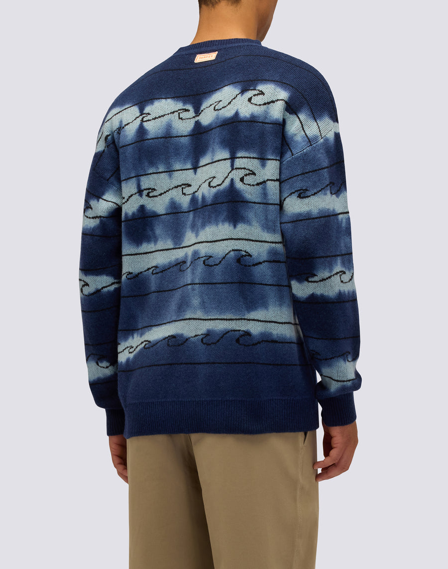 This men's jacquard cashmere crewneck sweater features a beautiful wave pattern, combining the sea—a key Sundek element—with winter. Its most distinctive feature is its hand-crafted Shibori dyeing technique, an ancient Japanese technique derived from the verb "shiboru" meaning "to tighten," "to twist," or "to press." The process involves folding, knotting, tying, or sewing sections of fabric to create reservoirs that lock in the dye, producing abstract, unique patterns.