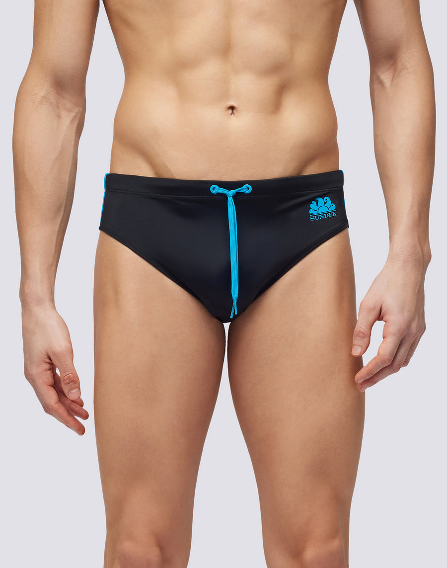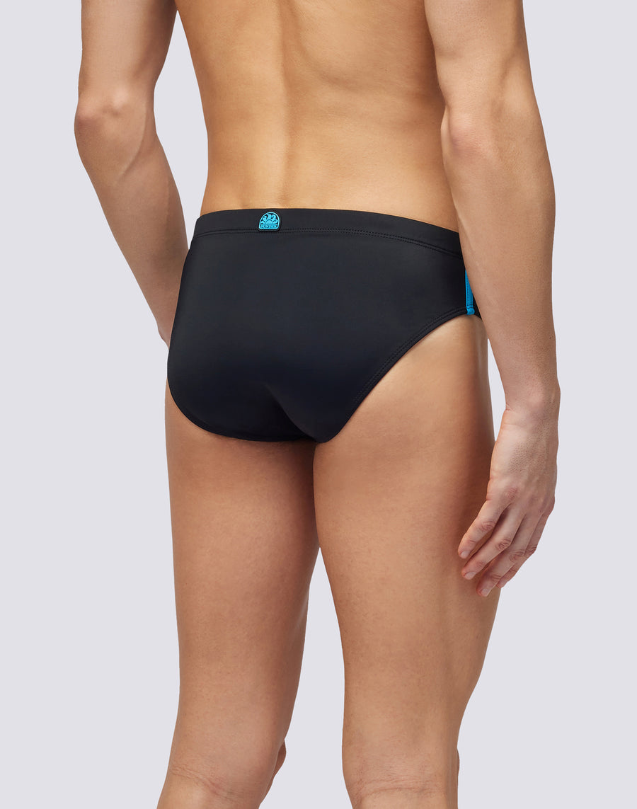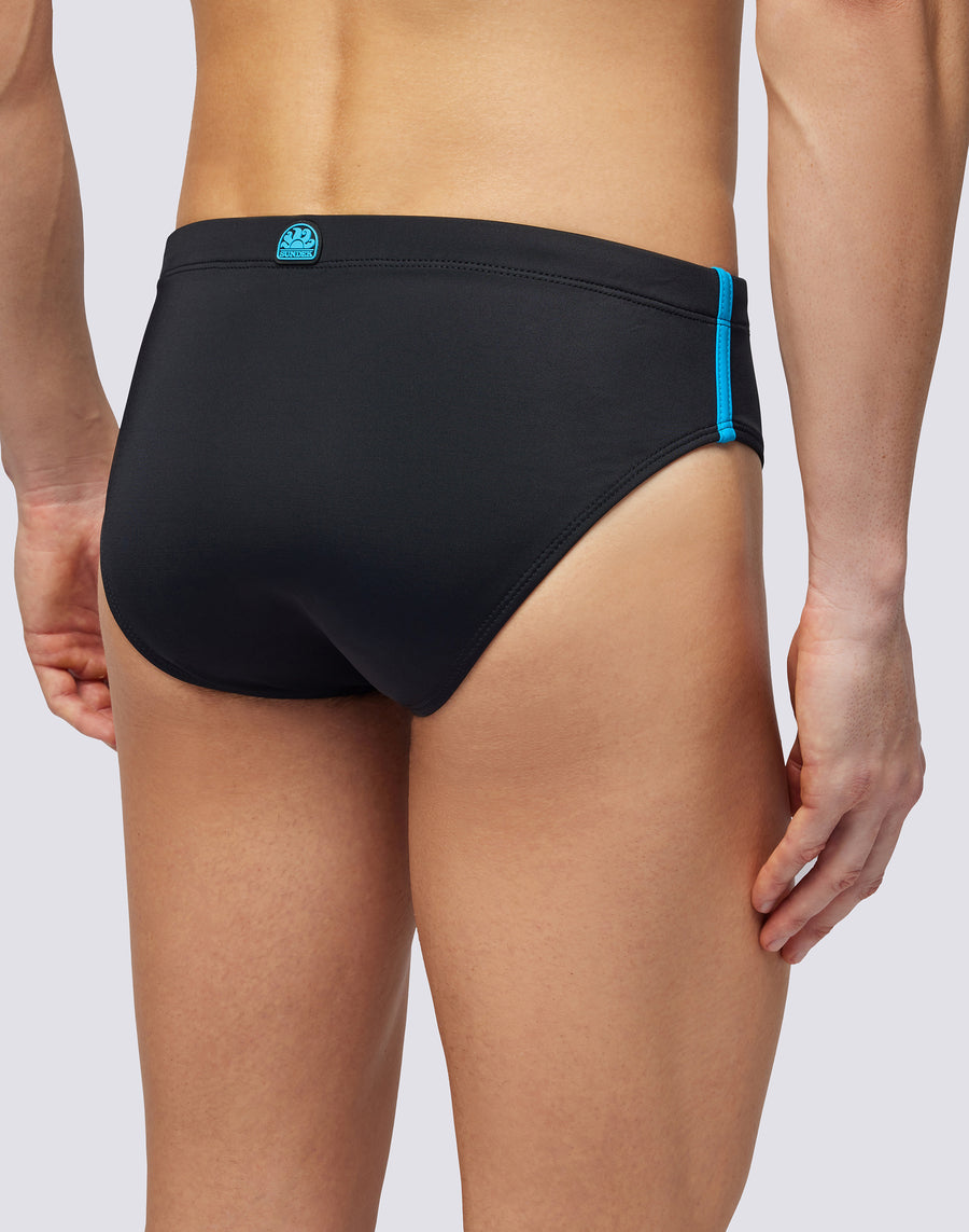Plain-coloured men's swimming briefs with side band, adjustable waist and drawstring. Swimming costume briefs in solid colour with contrasting one-colour side band, made of ECONYL® Made in Italy, an eco-friendly, durable and UV-protecting regenerated fabric. Perfect to wear for swimming, sunbathing and tanning.
