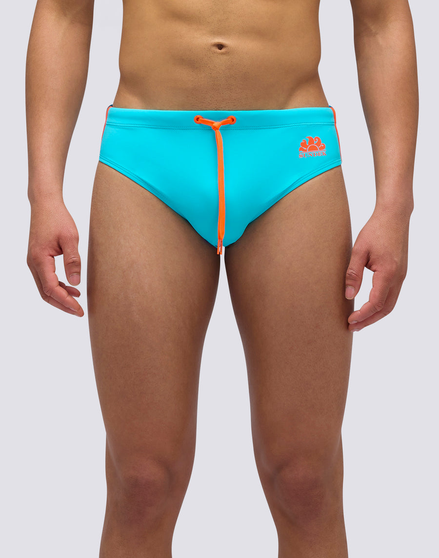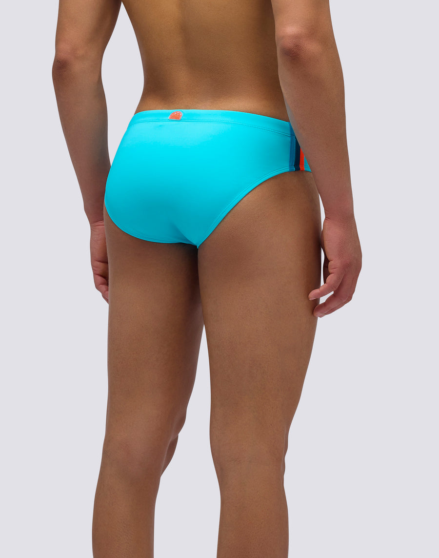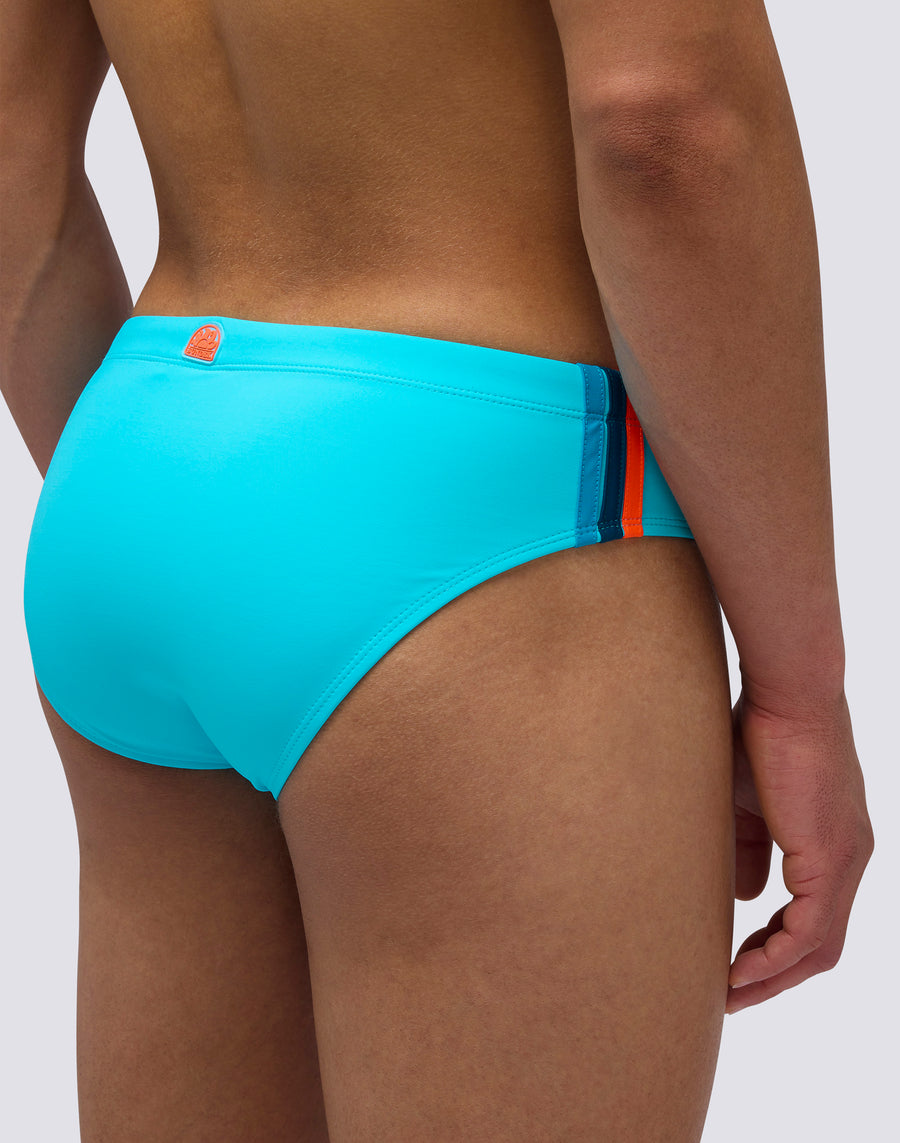 Men's plain briefs with an adjustable waistband Monochrome swim briefs with a drawstring and three contrasting stripes down the sides, combining bold style with functionality. Designed to dry quickly, they ensure comfort and durability in and out of the water.