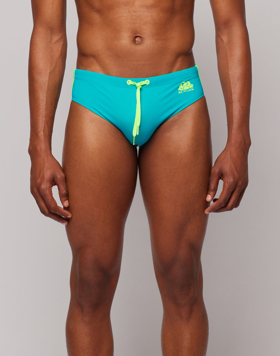 Men's plain briefs with an adjustable waistband Monochrome swim briefs with a drawstring and three contrasting stripes down the sides, combining bold style with functionality. Designed to dry quickly, they ensure comfort and durability in and out of the water.