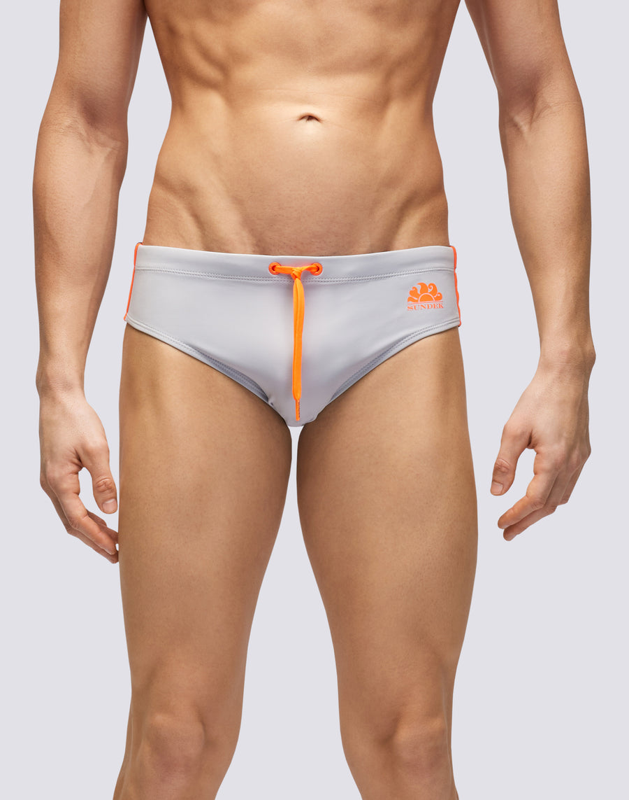 Men's plain briefs with an adjustable waistband Monochrome swim briefs with a drawstring and three contrasting stripes down the sides, combining bold style with functionality. Designed to dry quickly, they ensure comfort and durability in and out of the water.