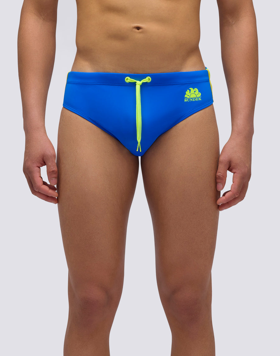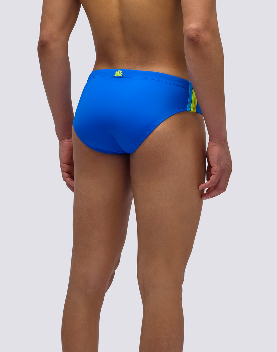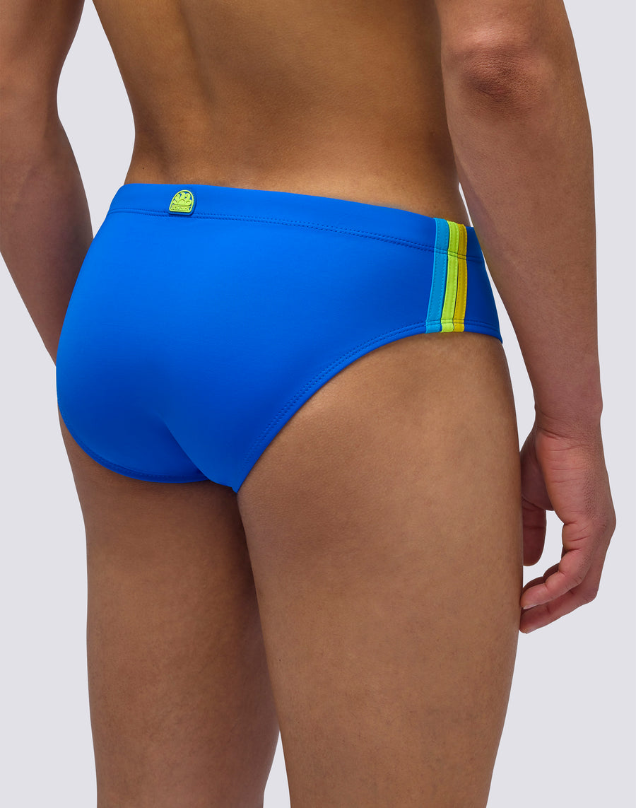 Men's plain briefs with an adjustable waistband Monochrome swim briefs with a drawstring and three contrasting stripes down the sides, combining bold style with functionality. Designed to dry quickly, they ensure comfort and durability in and out of the water.