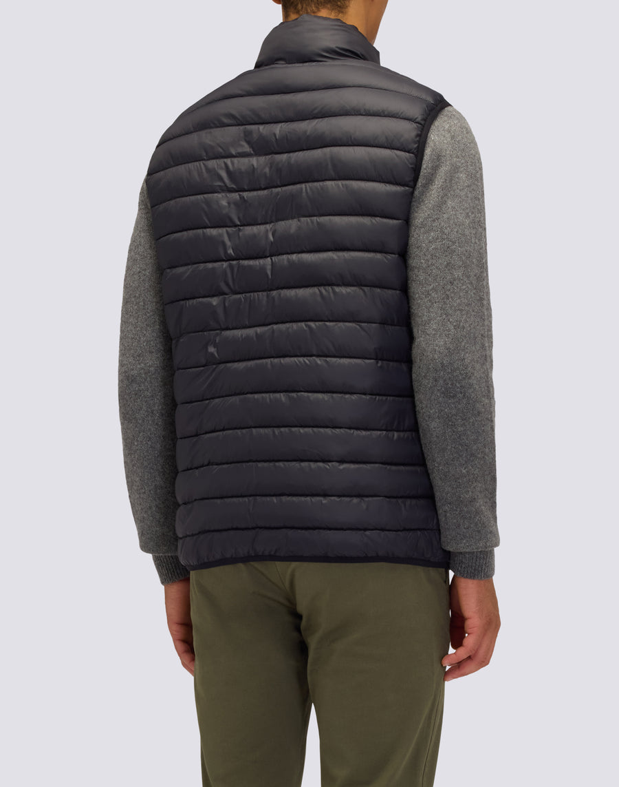 Men's padded vest with a stand-up collar in superlight matte nylon. Rich in functional details, this garment is ideal for wearing on cooler autumn days, layered with a sweatshirt or sweater. Filled with an innovative synthetic fiber made from Repreve® recycled polyester, it provides lightweight protection. Regular fit. Medium warmth.