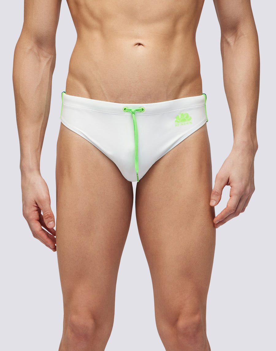 Solid color men's swimsuit briefs with adjustable waist. The monochrome swim briefs with drawstring and three contrasting colored side bands for a strong and functional look. It dries quickly and gives you comfort and durability in and out of the water: wear it for swimming and training and when you rest and sunbathe.