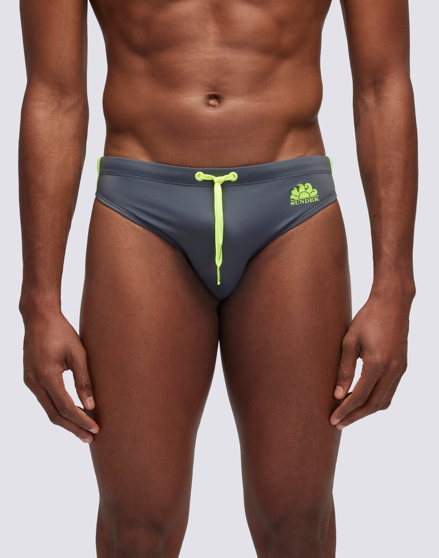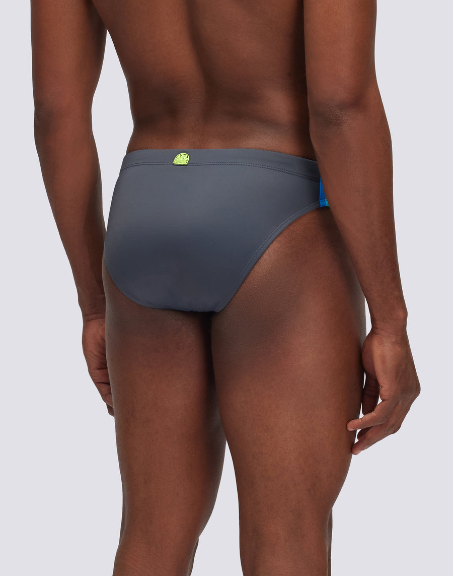 Solid color men's swimsuit briefs with adjustable waist. The monochrome swim briefs with drawstring and three contrasting colored side bands for a strong and functional look. It dries quickly and gives you comfort and durability in and out of the water: wear it for swimming and training and when you rest and sunbathe.