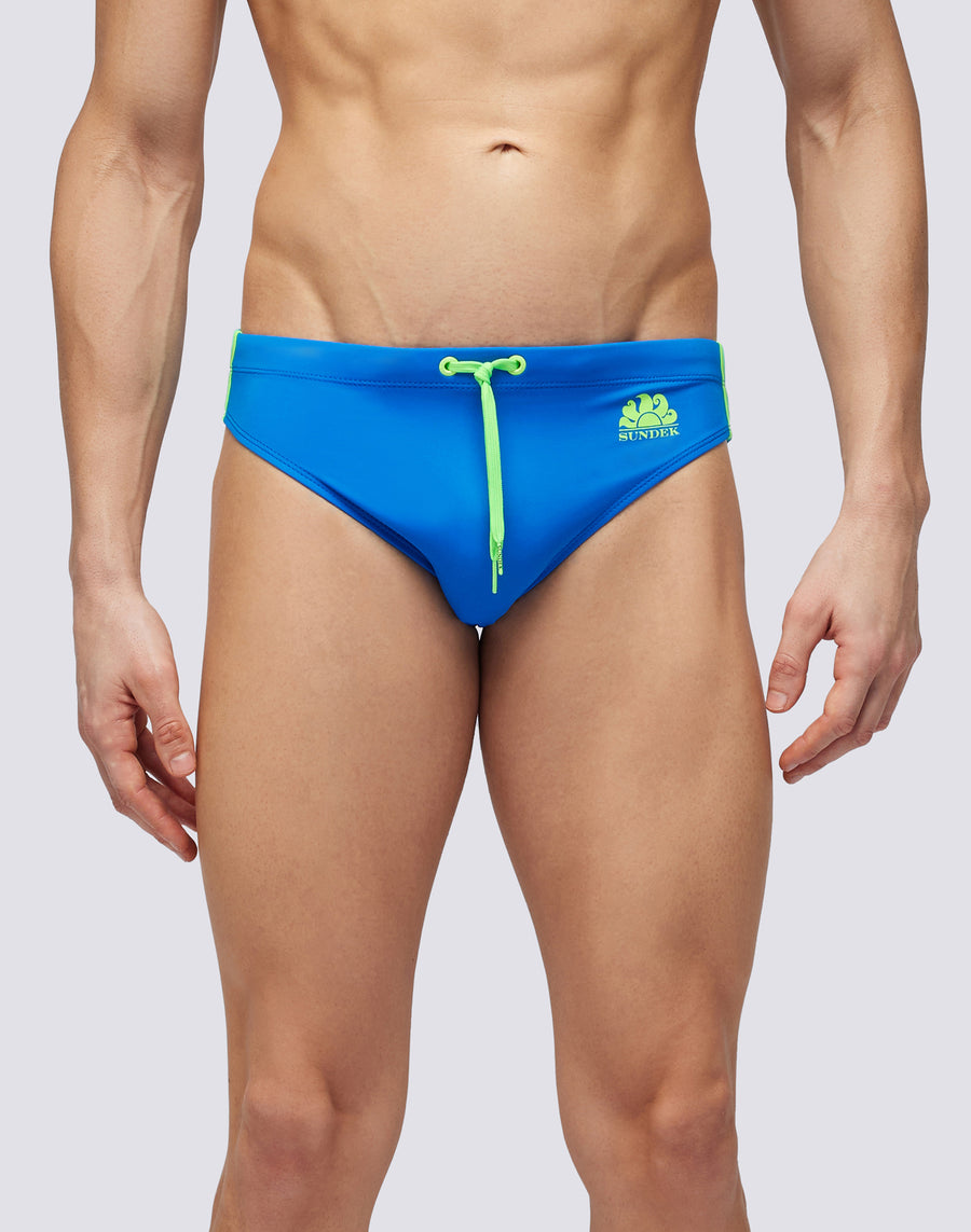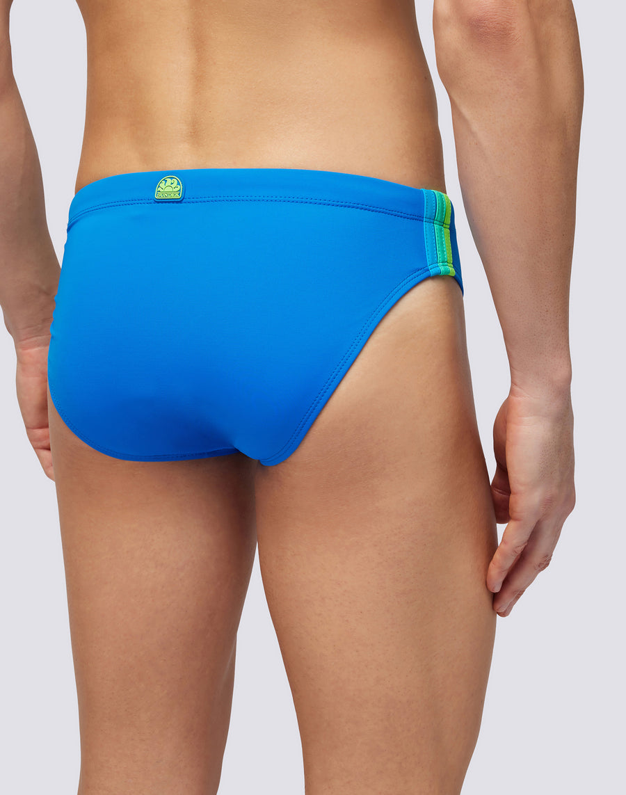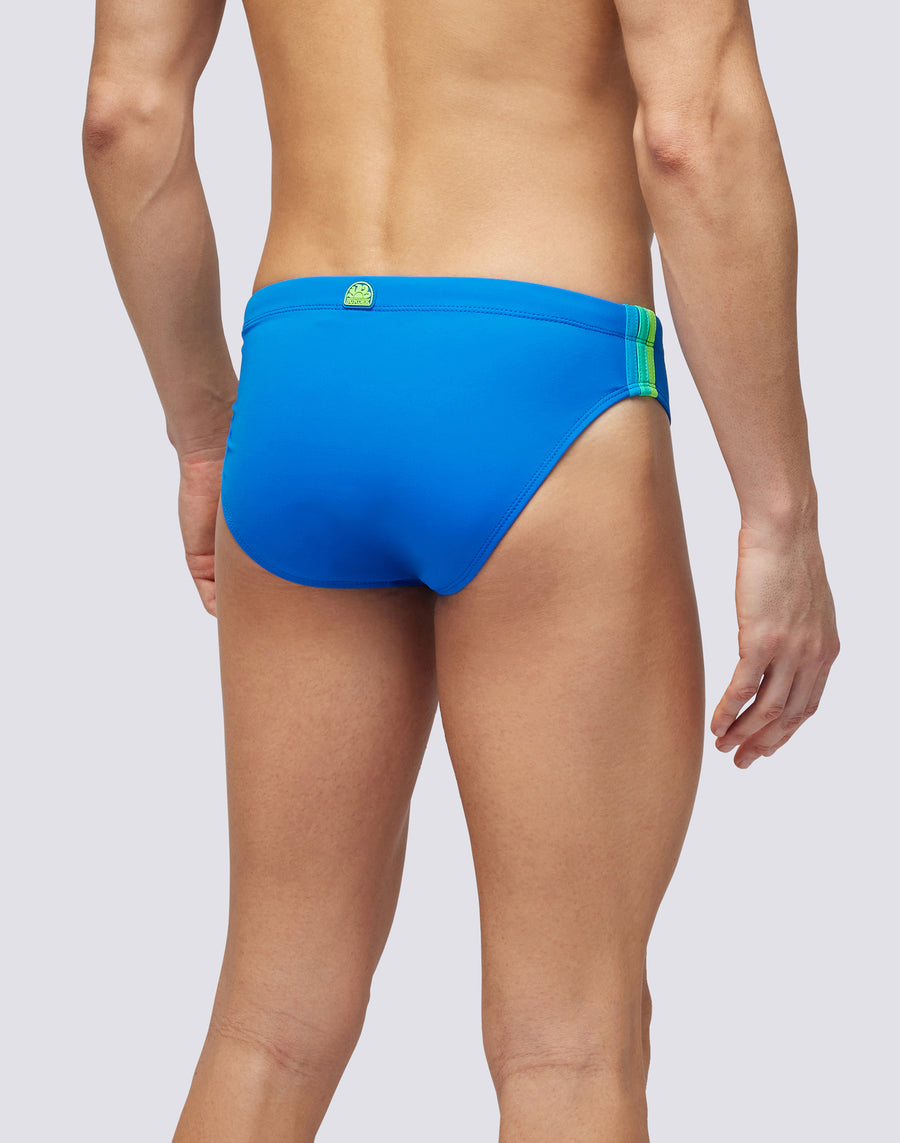 Solid color men's swimsuit briefs with adjustable waist. The monochrome swim briefs with drawstring and three contrasting colored side bands for a strong and functional look. It dries quickly and gives you comfort and durability in and out of the water: wear it for swimming and training and when you rest and sunbathe.