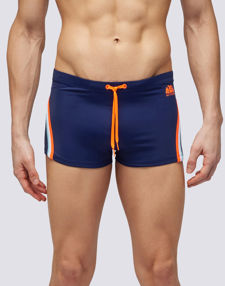 Men's swim boxer with adjustable waist with drawstring and contrasting drawstring: it is a timeless model in step with the times because it is eco-sustainable thanks to the ECONYL® regenerated fabric Made in Italy. You can wear it for swimming as well as for sunbathing and tanning. Outer leg length 9"/23cm (in size M).