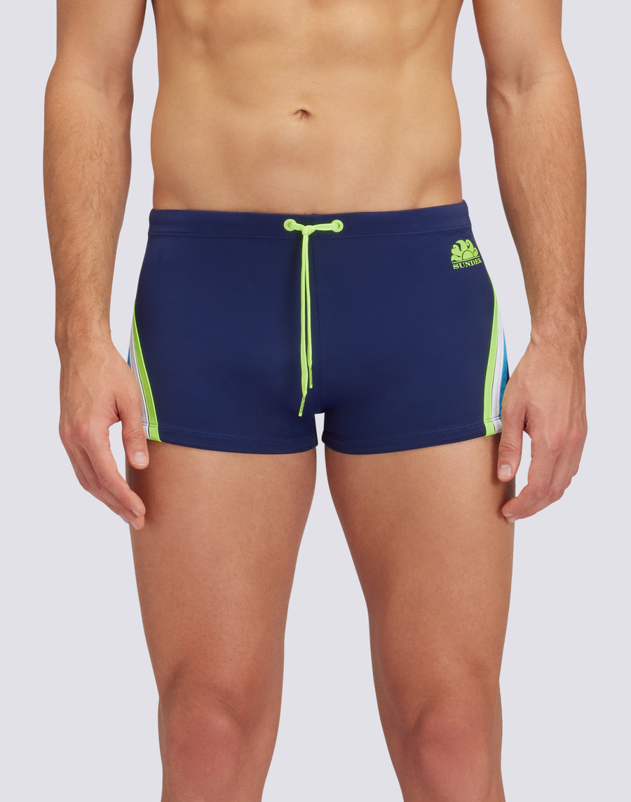 Men's swim boxer with adjustable waist with drawstring and contrasting drawstring: it is a timeless model in step with the times because it is eco-sustainable thanks to the ECONYL® regenerated fabric Made in Italy. You can wear it for swimming as well as for sunbathing and tanning. Outer leg length 9"/23cm (in size M).