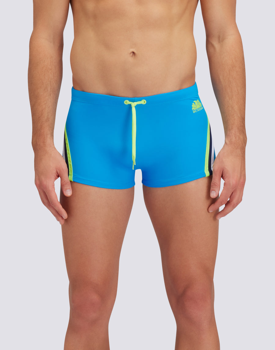 Men's swim boxer with adjustable waist with drawstring and contrasting drawstring: it is a timeless model in step with the times because it is eco-sustainable thanks to the ECONYL® regenerated fabric Made in Italy. You can wear it for swimming as well as for sunbathing and tanning. Outer leg length 9"/23cm (in size M).