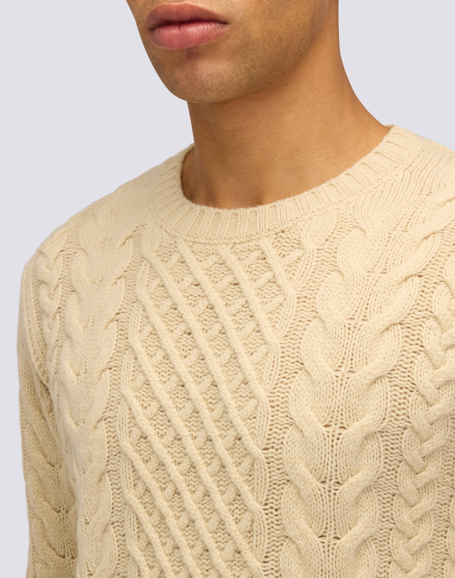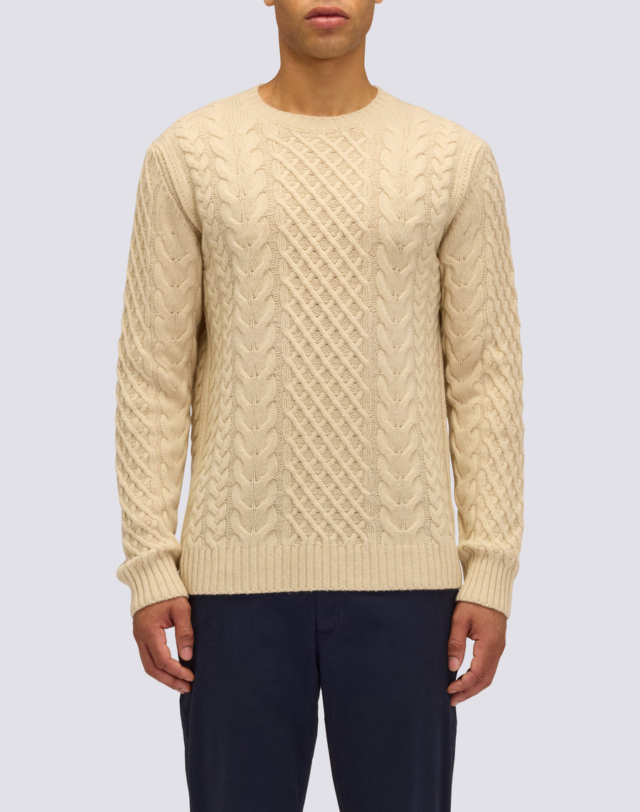 Men's crewneck sweater in a cashmere blend with a cable knit pattern; ideal for both casual and more elaborate outfits.