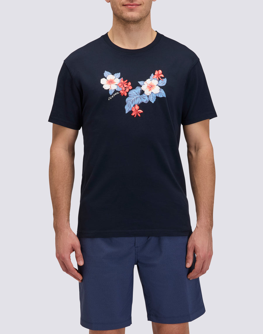 Men's short-sleeved T-shirt with floral micro print on the front.