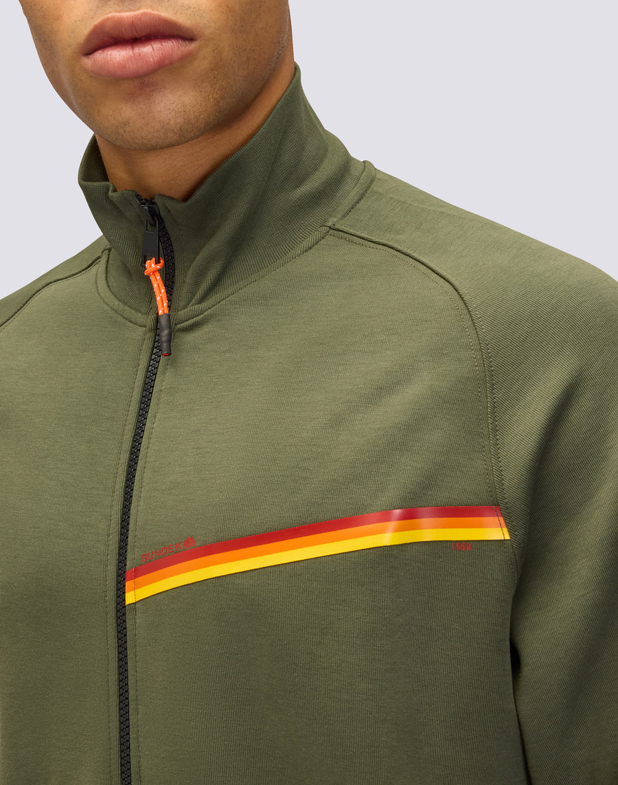 Men's full-zip sweatshirt in recycled Interlock cotton. The archival rainbow detail printed on the side front creates contrast and is a nice touch for a simple, sporty, casual garment.