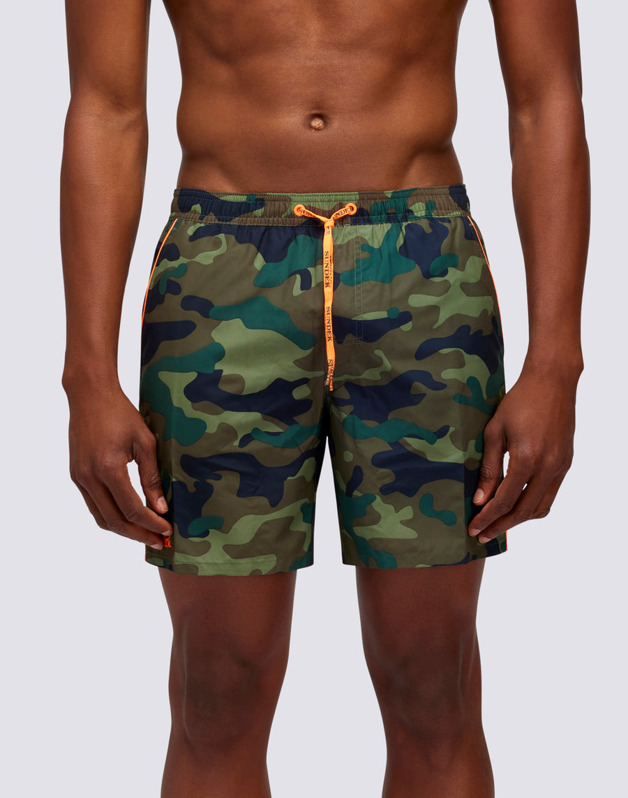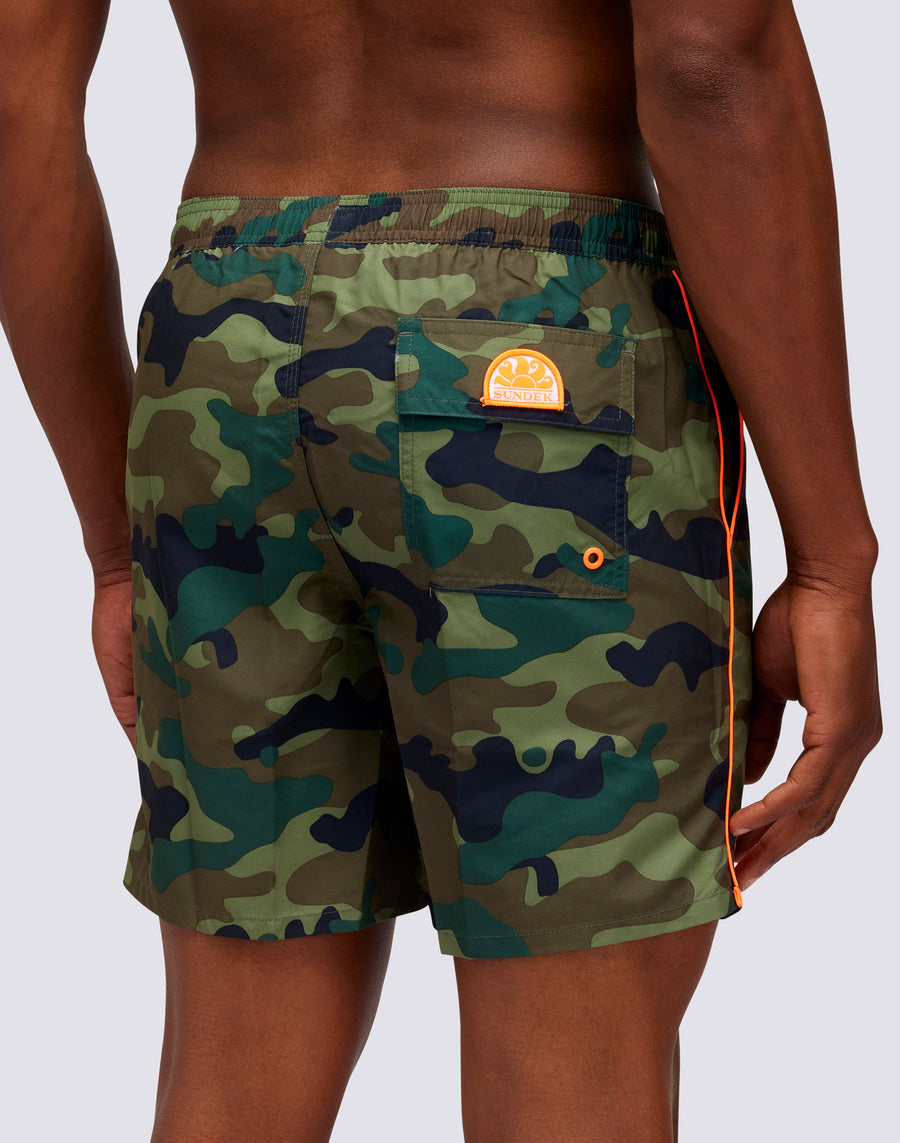 The camouflage print won't let your average Sundek swimming costume go unnoticed with its elasticated waist, comfortable and perfect thanks to the three-needle stitching that makes it super resistant. Made of basic micropeach polyester, it has a small pocket on the back and contrasting piping on the sides. External leg length 16"/41 cm (in size M).