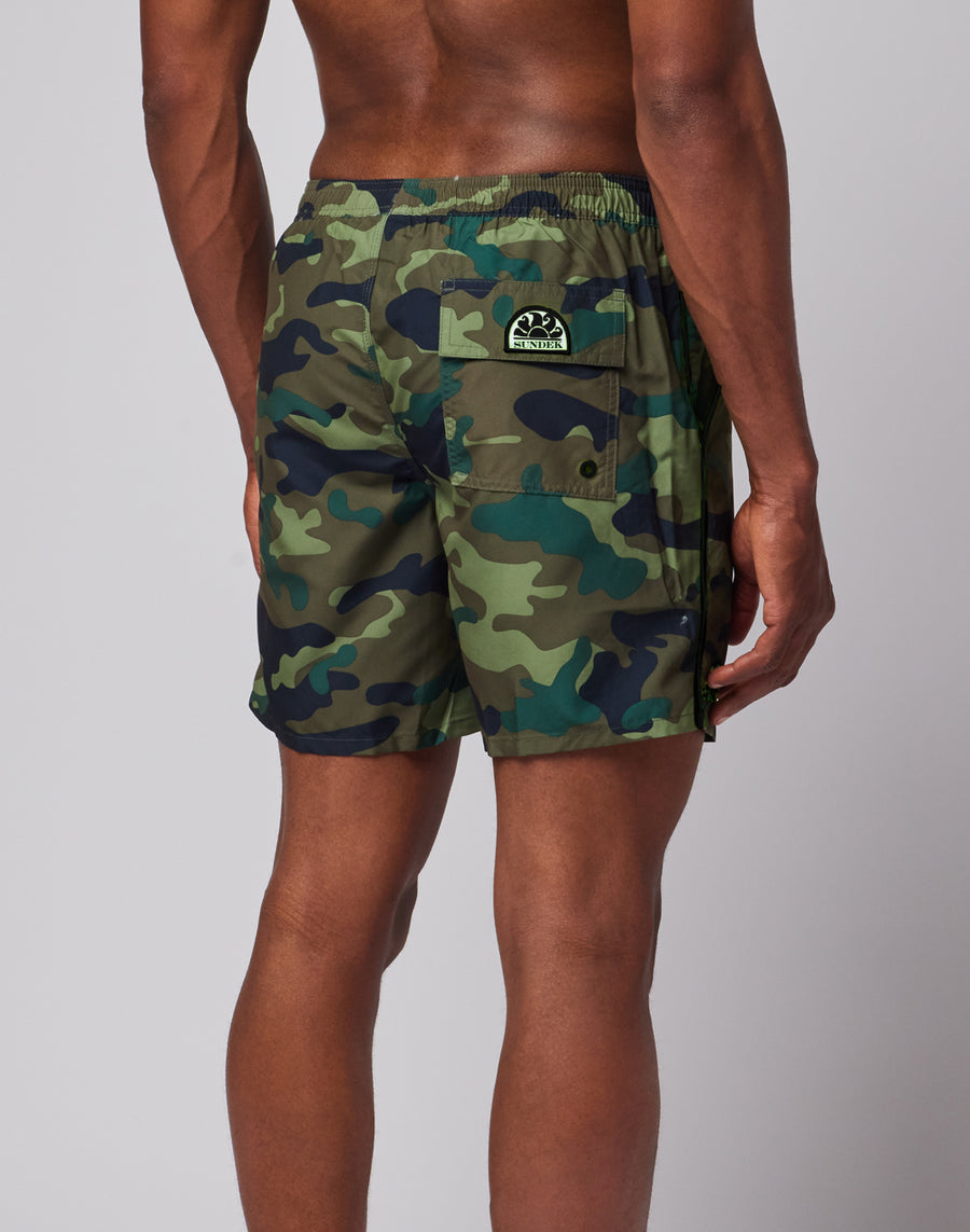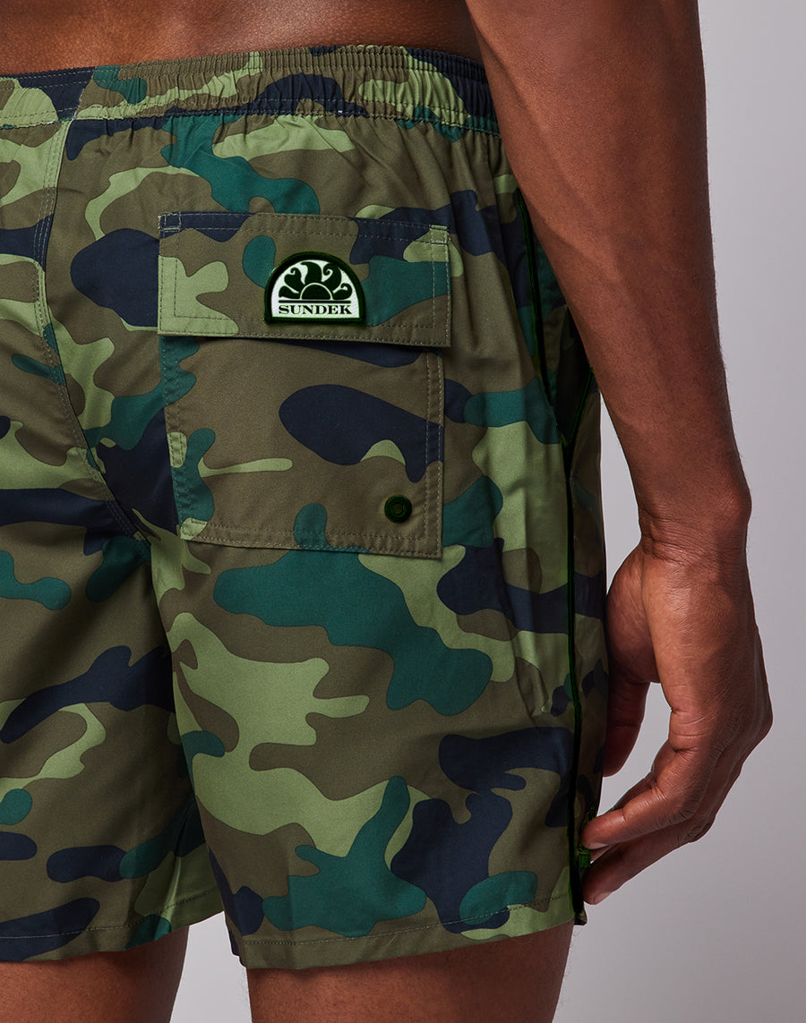 Pervis men's swim trunks in camou pattern, with elasticated waist. Equipped with drawstring and contrasting piping, triple stitching on the areas of greatest stress to ensure superior resistance. Back pocket with velcro and embroidered logo. Outside leg length 16”/41 cm (in size M).