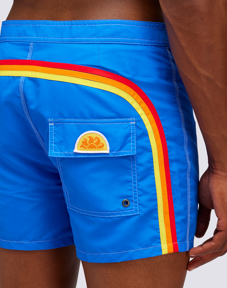 Men's shorts with shaped waistband in Nylon Taffeta fabric. The developed model is a new edition of the historic Sundek 501, an icon of the brand. The rear rainbow detail also takes up the historical colors. Outer thigh length 14"/35 CM (size 32).