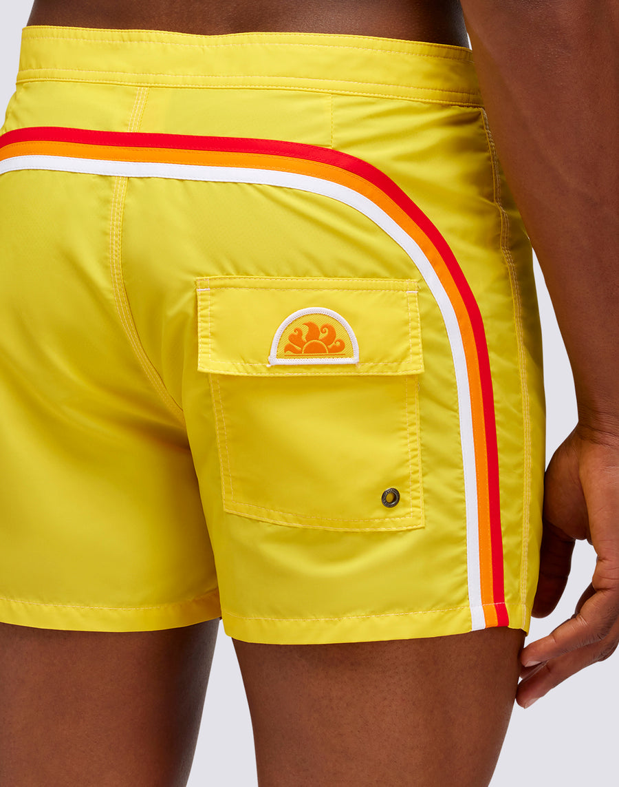 Men's shorts with shaped waistband in Nylon Taffeta fabric. The developed model is a new edition of the historic Sundek 501, an icon of the brand. The rear rainbow detail also takes up the historical colors. Outer thigh length 14"/35 CM (size 32).