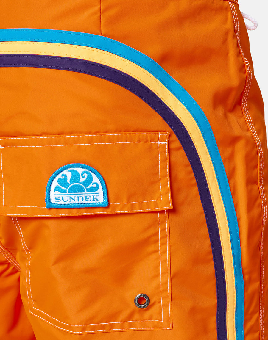 Vibrant energy, intense colour and the iconic Sundek rainbow peeping through this men's boxer swimming costume. It's made from our historic nylon taffeta fabric, with a silky comfortable and quick-drying hand, while three-needle stitching makes it durable holiday after holiday.