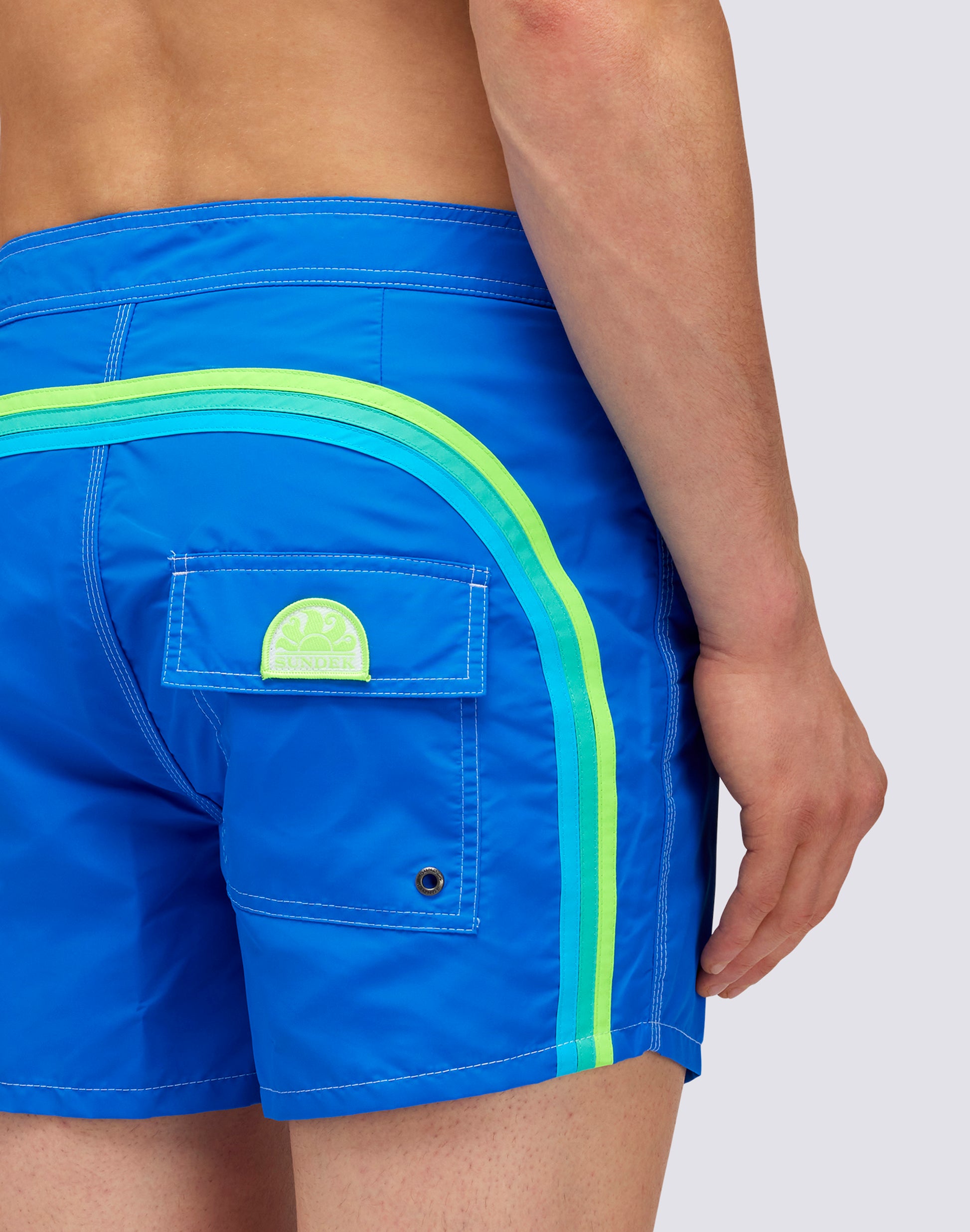 Vibrant energy, intense color and the iconic Sundek rainbow peeking out for this men's boxer shorts. It's made from our heritage nylon taffeta fabric, with a comfortable, quick-drying silky feel, while three-needle stitching makes it durable vacation after vacation. Length 35 cm (size M), measured on the outside of the leg.