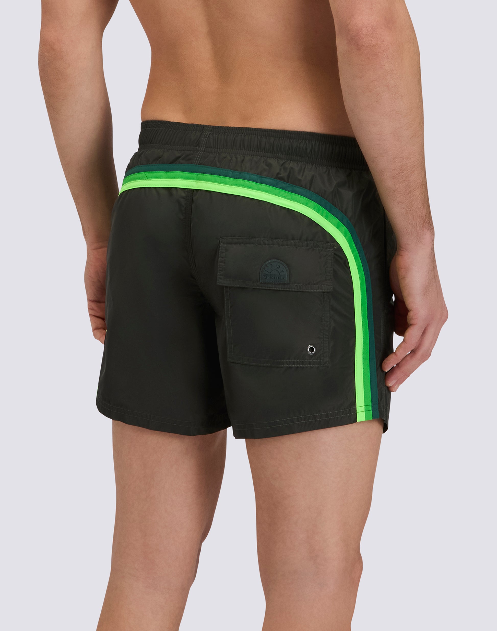 Solid-coloured short men's swimshorts with bright colours and back pocket with tone-on-tone patch and Velcro fastener. Lightweight, durable, quick-drying and made of Memory polyester, a technical fabric that retains its shape over time. It has our classic three-needle stitching for added strength and our iconic rainbow on the back.