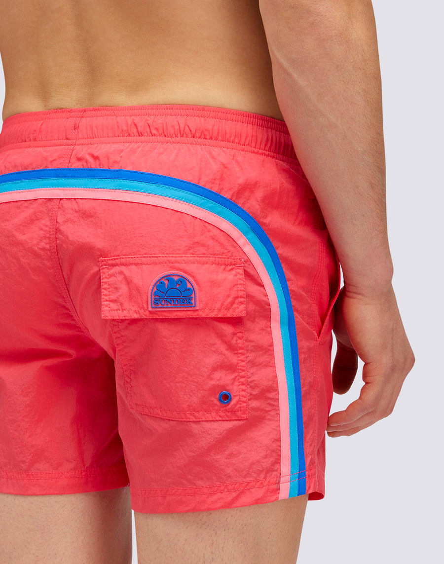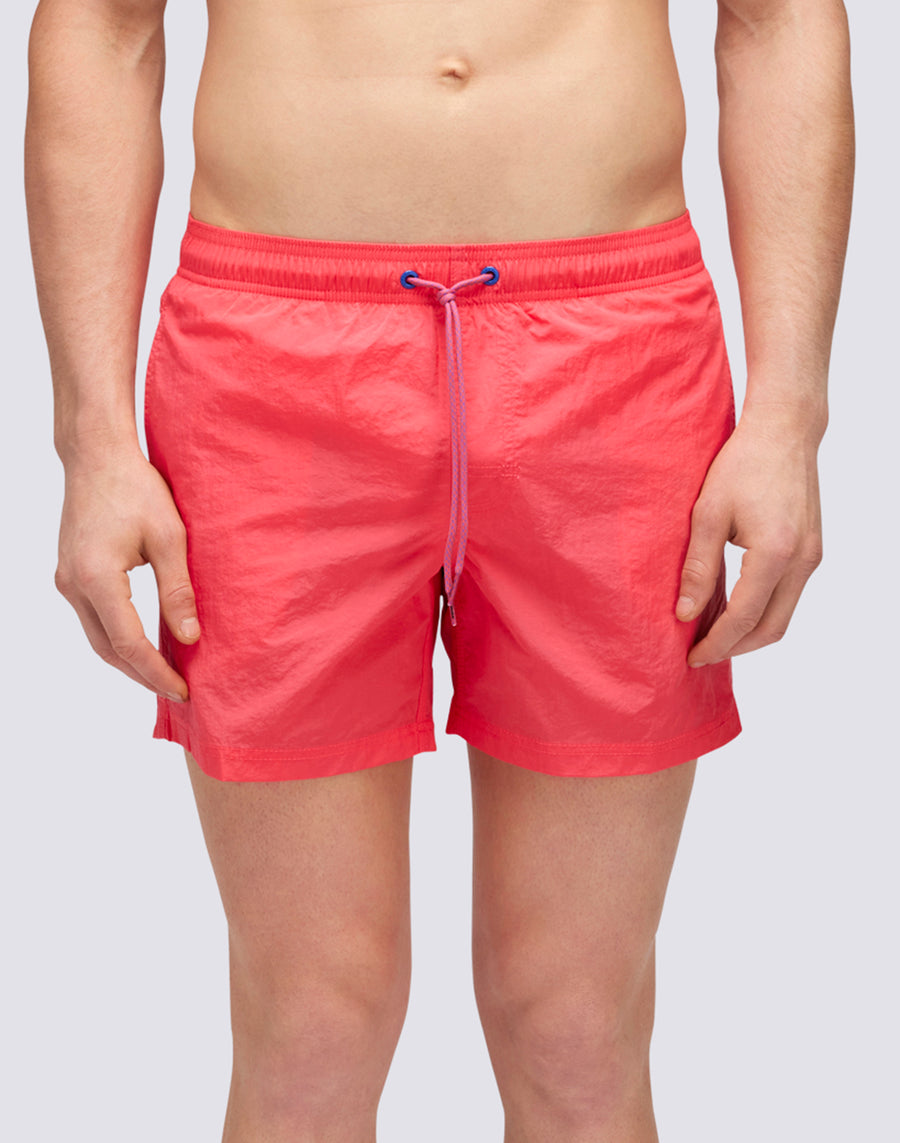 Solid-coloured short men's swimming costume in bright colours. Lightweight, durable, quick-drying and made of nylon taffeta, Sundek's iconic fabric. It has our classic three-needle stitching for durability and our rainbow on the back.