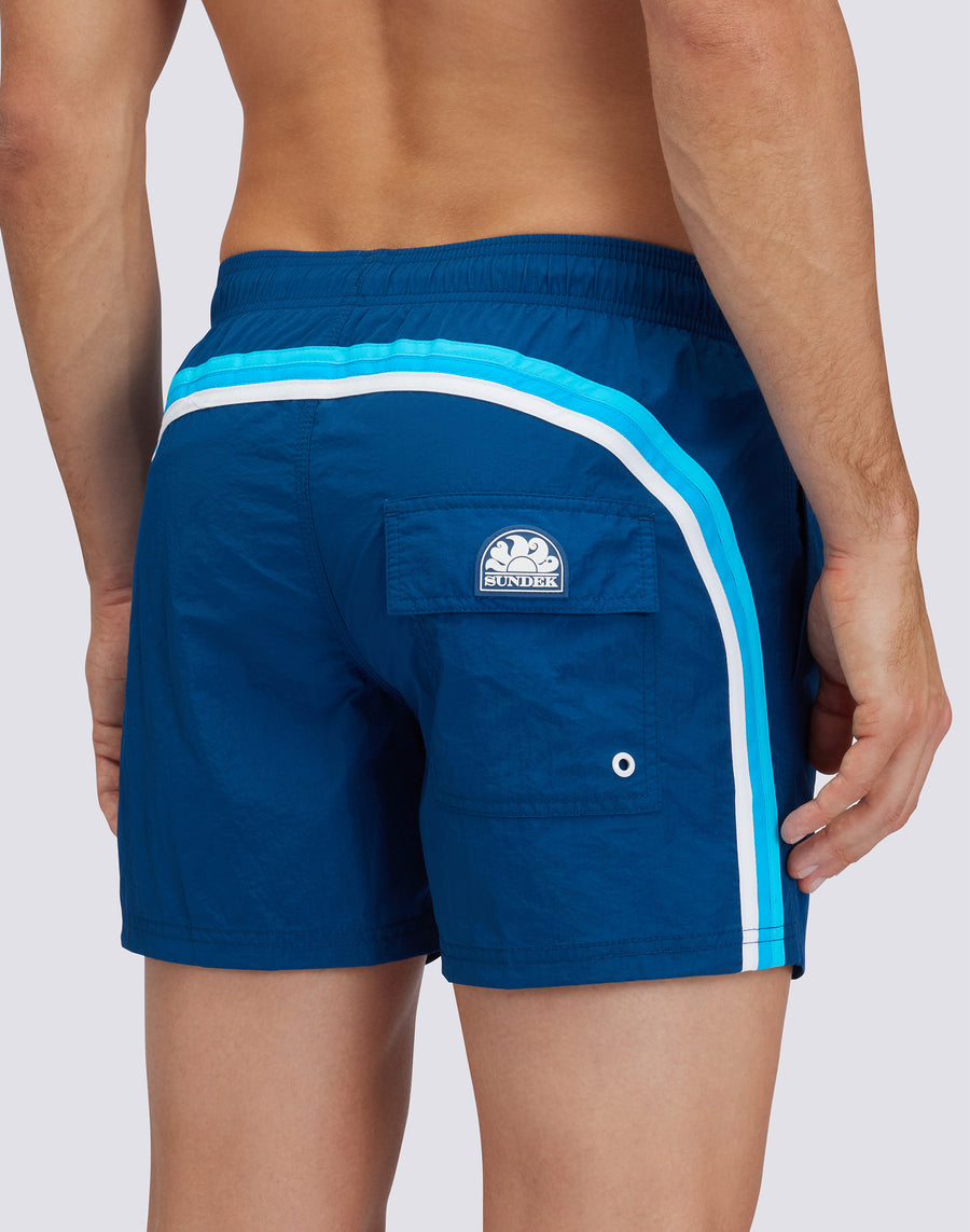 Solid-coloured short men's swimming costume in bright colours. Lightweight, durable, quick-drying and made of nylon taffeta, Sundek's iconic fabric. It has our classic three-needle stitching for durability and our rainbow on the back.