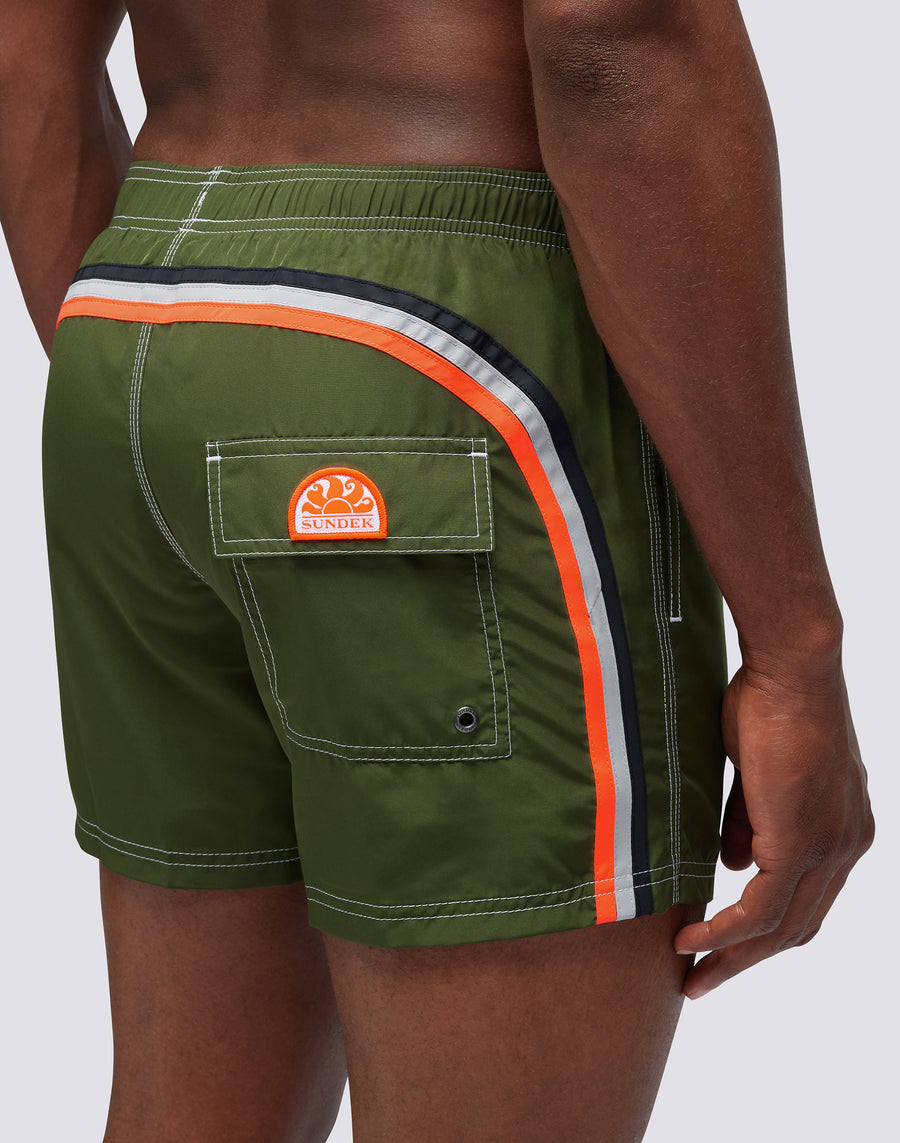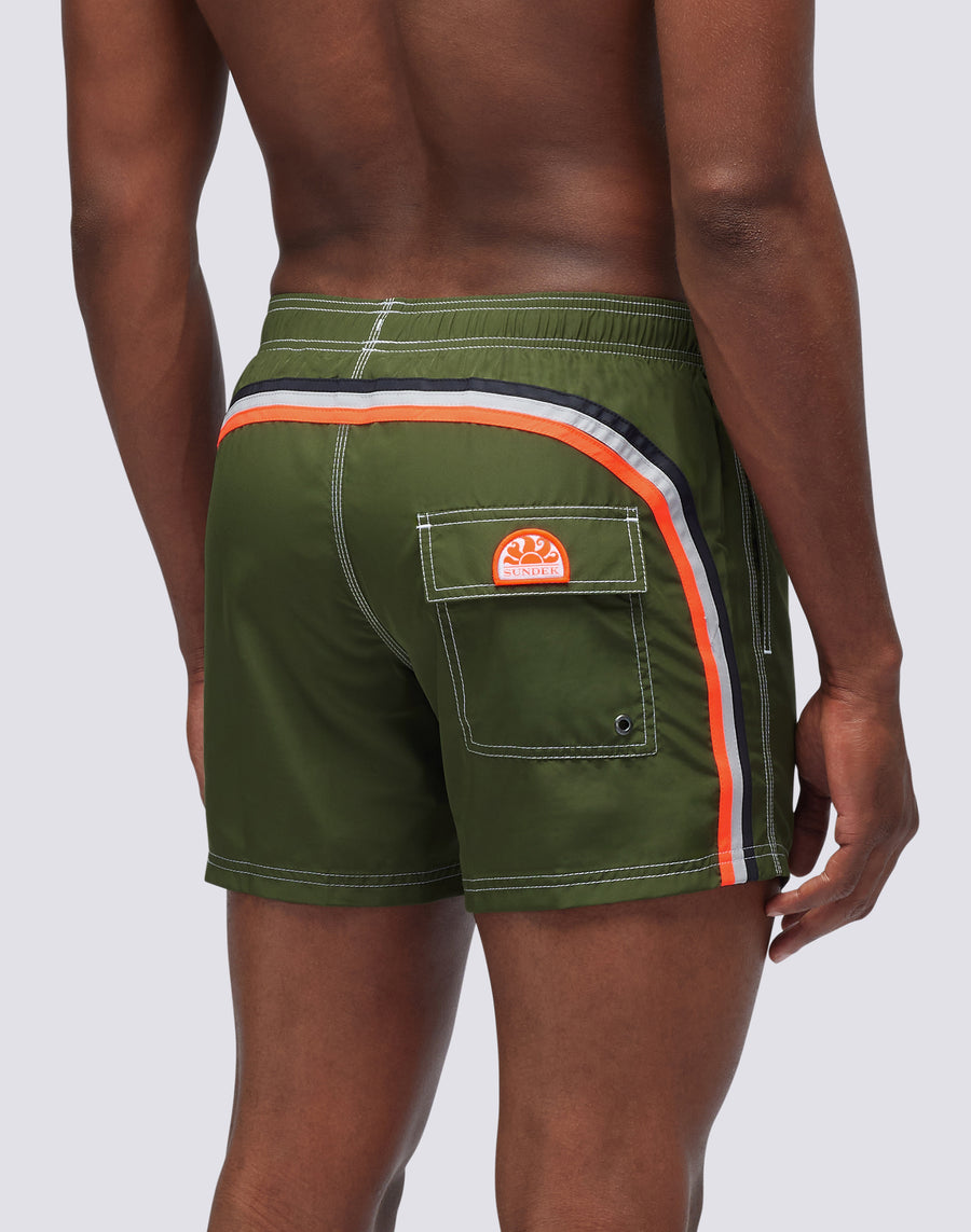 Short swimsuit with elasticated waist, made in our iconic Nylon Taffeta fabric. Equipped with triple stitching on the areas of greatest stress, it guarantees resistance and durability over time. The iconic rainbow characterizes the back. Length on the outer thigh 14''/35 cm (in size M).