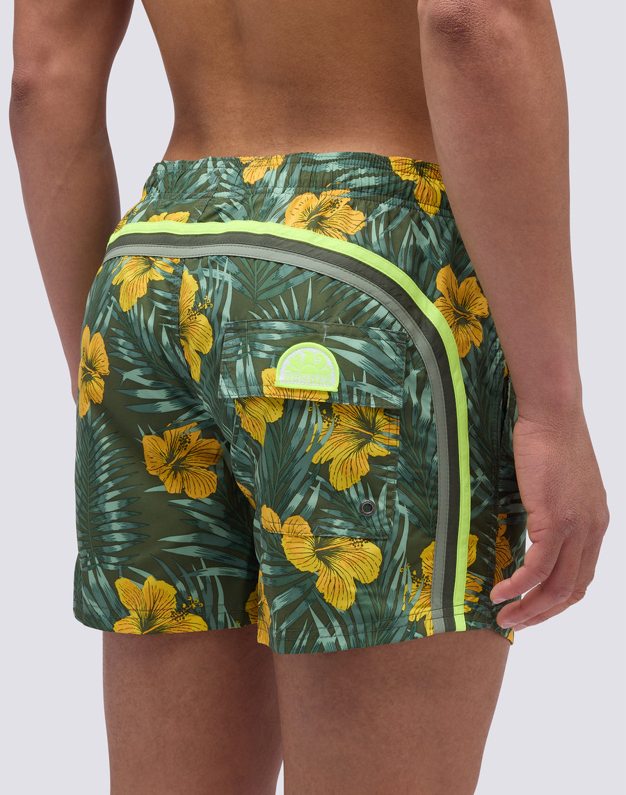 Men's shorts in lightweight, quick-drying Polyester fabric. Iconic Sundek rainbow detail on the back and floral print. Outer thigh length 14”/35 CM (in size M).