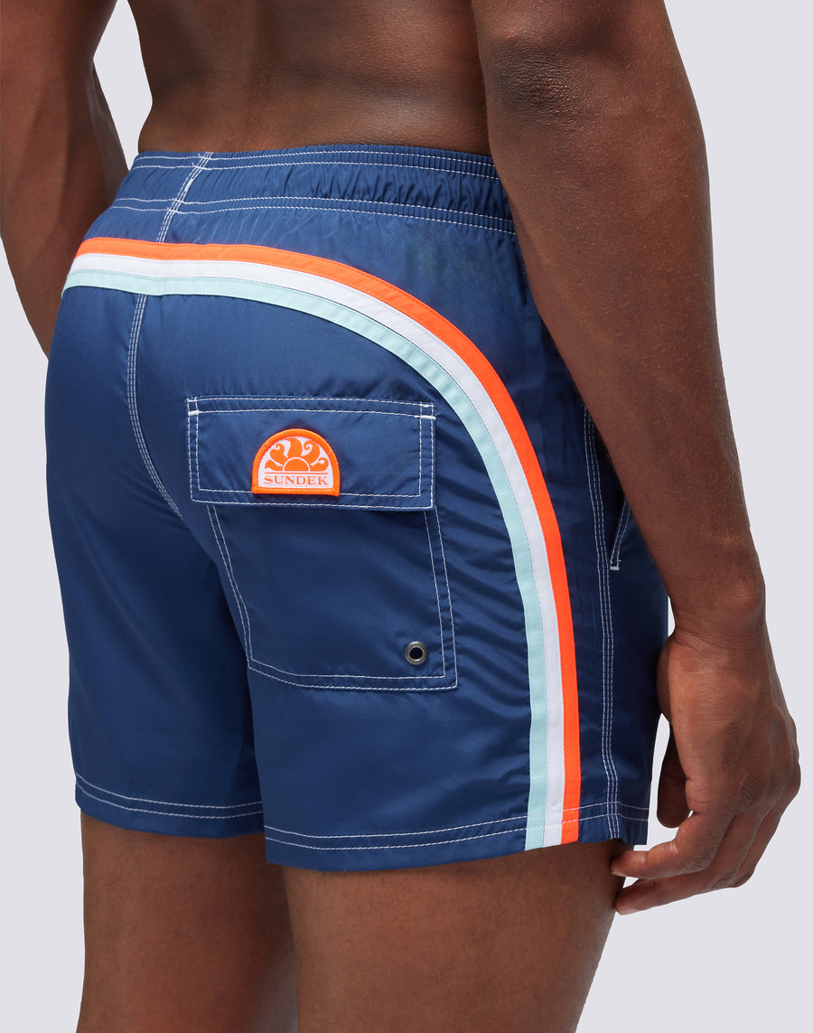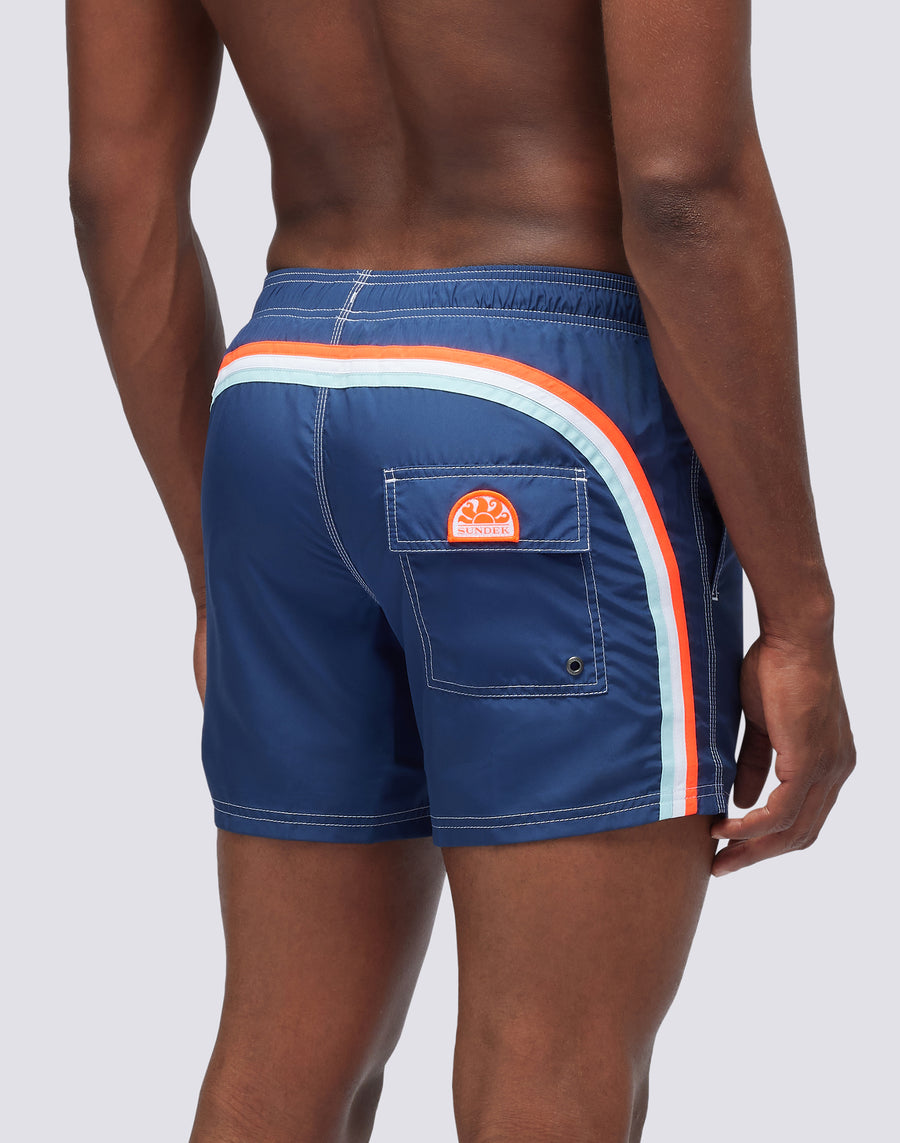 Short swimsuit with elasticated waist, made in our iconic Nylon Taffeta fabric. Equipped with triple stitching on the areas of greatest stress, it guarantees resistance and durability over time. The iconic rainbow characterizes the back. Length on the outer thigh 14''/35 cm (in size M).
