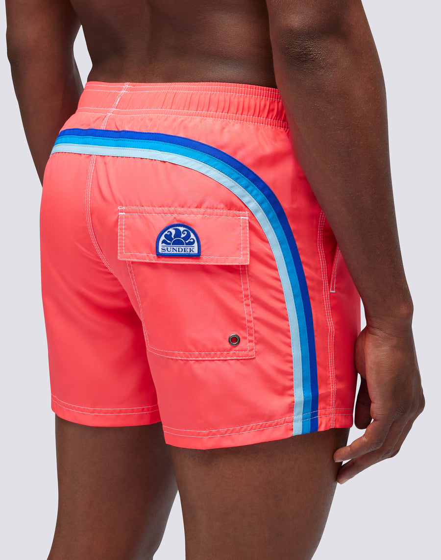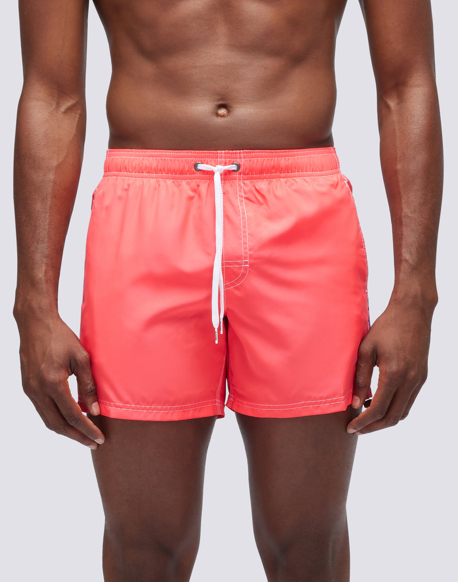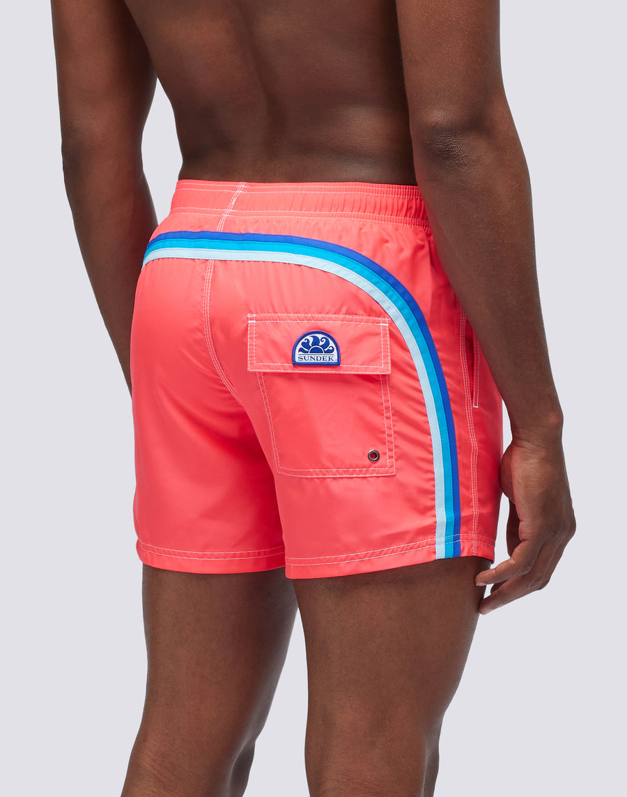 Short swimsuit with elasticated waist, made in our iconic Nylon Taffeta fabric. Equipped with triple stitching on the areas of greatest stress, it guarantees resistance and durability over time. The iconic rainbow characterizes the back. Length on the outer thigh 14''/35 cm (in size M).