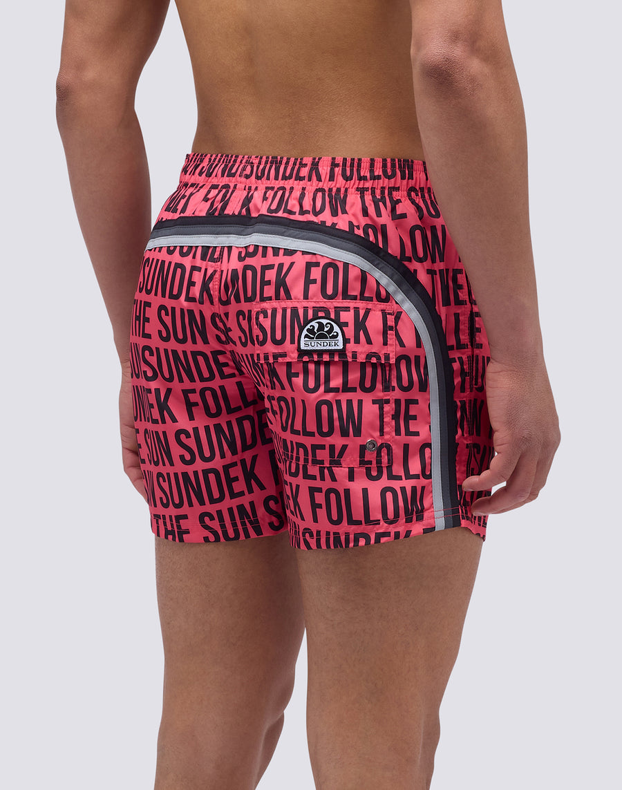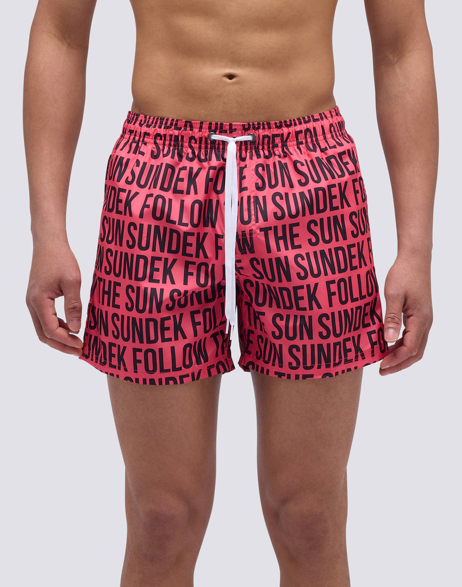 Men's shorts in lightweight, quick-drying Polyester fabric. Iconic Sundek rainbow detail on the back and print. Outer thigh length 14”/35 CM (in size M).