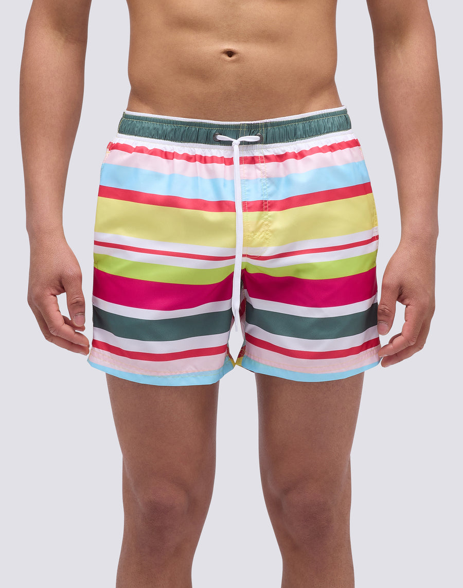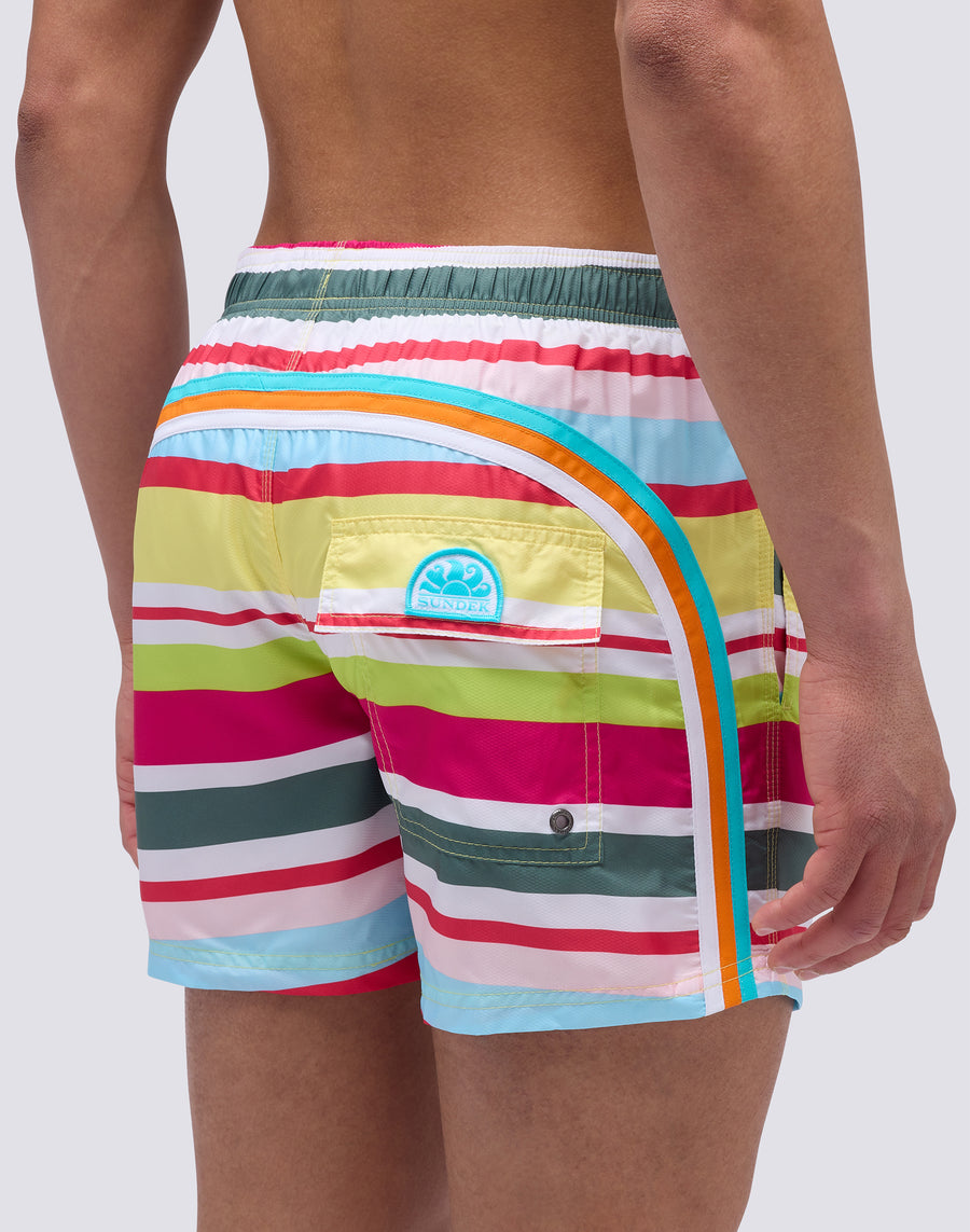 SHORT SWIMSUIT WITH ELASTIC WAIST AND MULTI-STRIPE PRINT