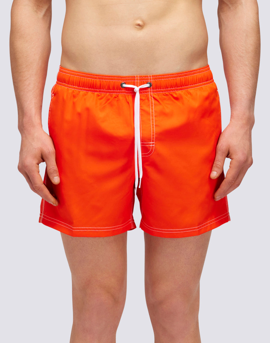 Men's swim shorts in Repreve recycled fabric, lightweight and quick drying. Iconic Sundek rainbow detail on the back. Outer thigh length 14"/35 CM (in size M).