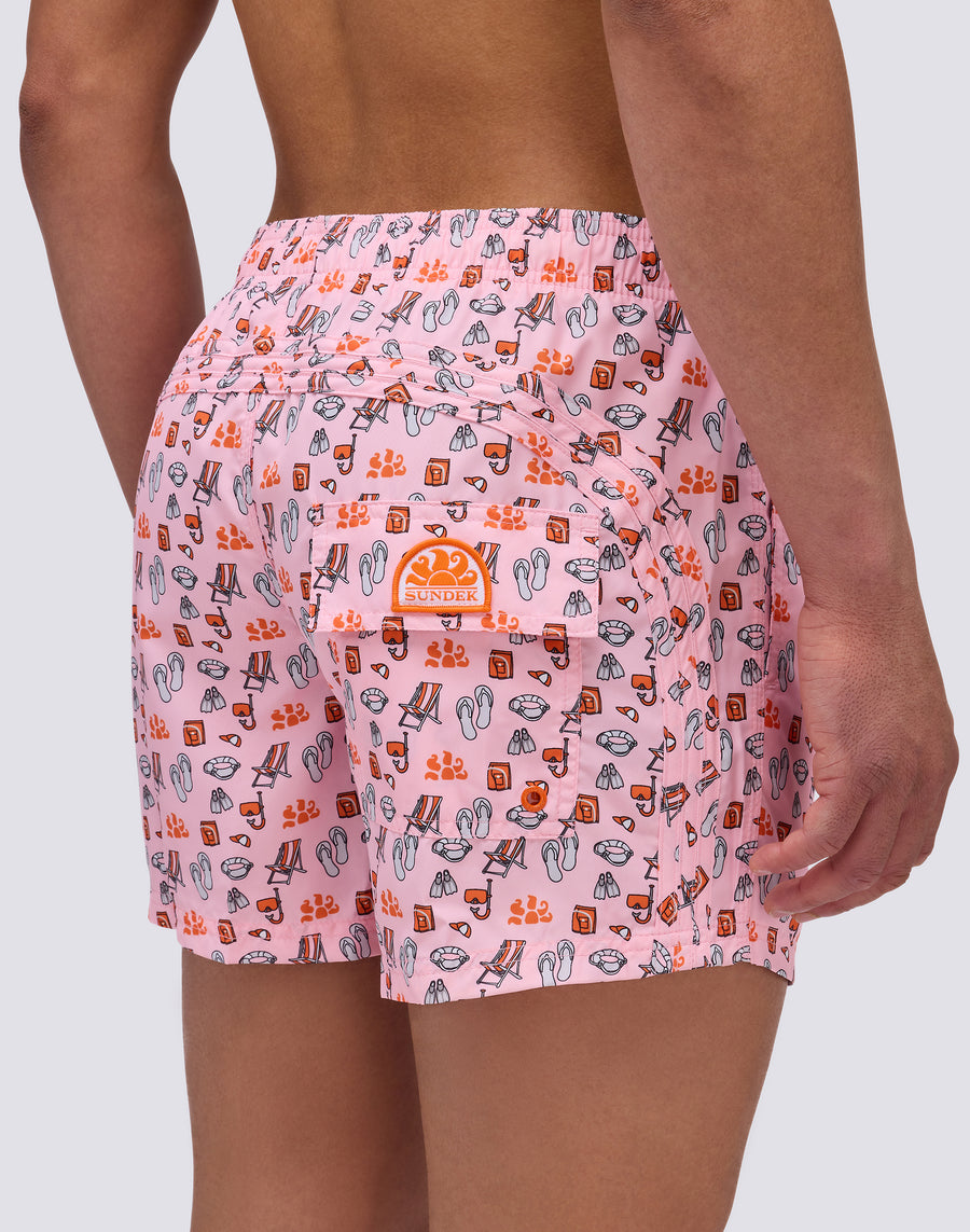 Swimshorts with elasticated drawstring waist, made from lightweight Repreve® fabric recycled from plastic bottles. Mini print featuring beach essentials and traditional Sundek rainbow in a tone-on-tone colour on the back. Outer thigh width 14"/35 cm (size M).