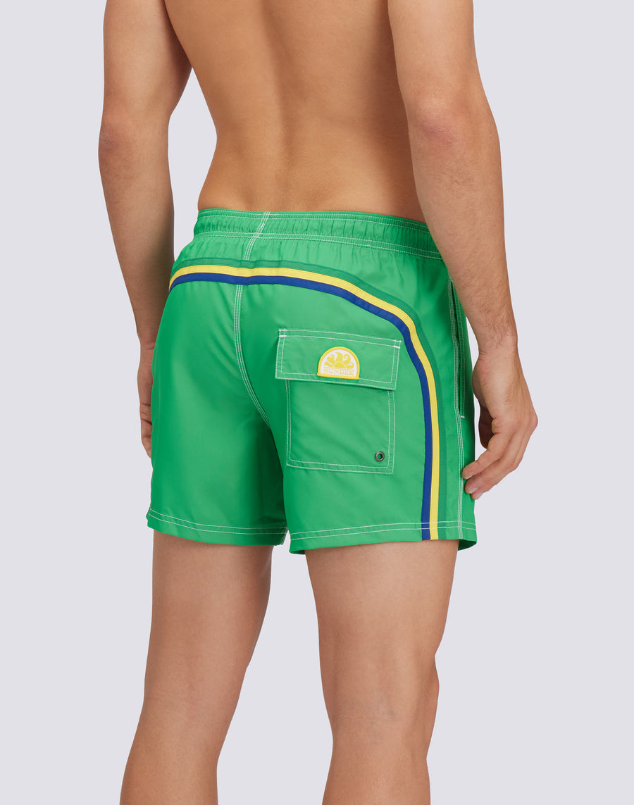 Men's shorts swimsuit made of Repreve® recycled fabric, a super lightweight quick-drying fabric. Sundek iconic rainbow detail on back and Brazil flag representation. Outer thigh length 14"/35 CM (in size M).